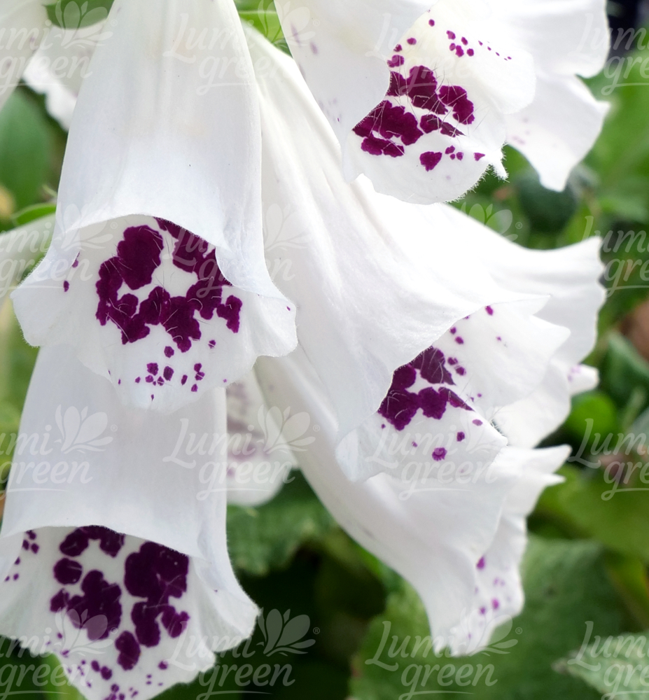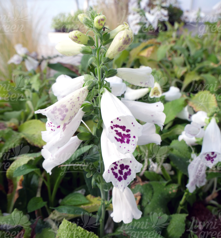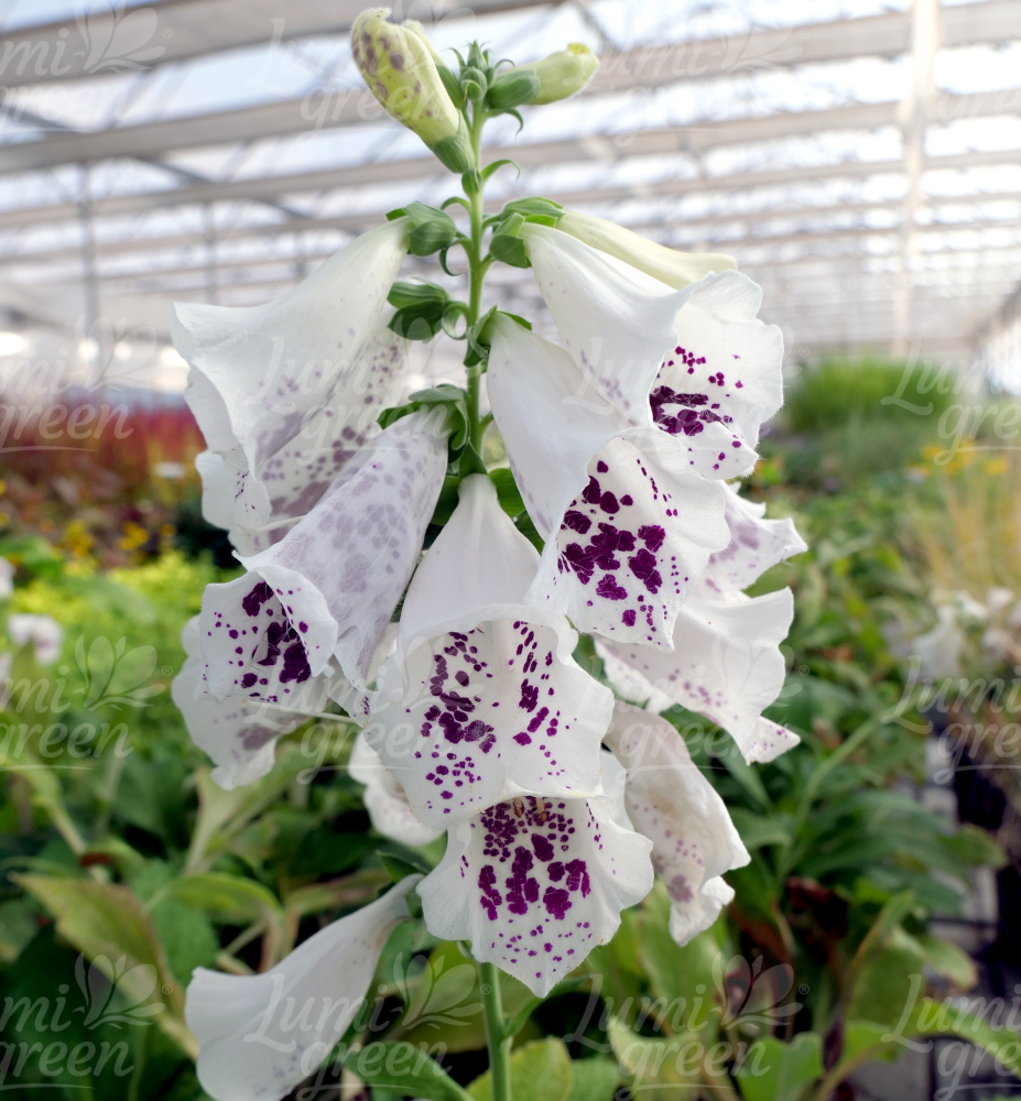 Eigenschaften: Der Fingerhut ´DOTTIE WHITE´ gehört zu den traditionellen Stauden unserer Gärten. Sie blüht ab Juni mit äußerst eleganten glockenförmigen Blüten, die mit einem kontrastierenden violetten Punktmuster verziert sind. Sie wird 50-60 cm hoch. Die Blätter sind relativ groß, matt und mittelgrün gefärbt. Sie eignet sich hervorragend für Blumenbeete, wo sie in Gruppen oder als Solitärpflanze gepflanzt werden kann.