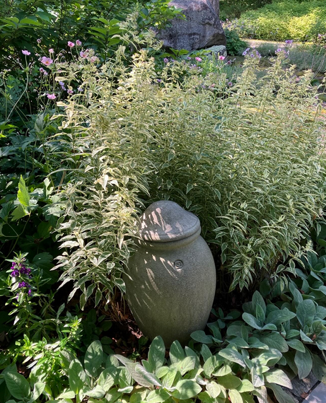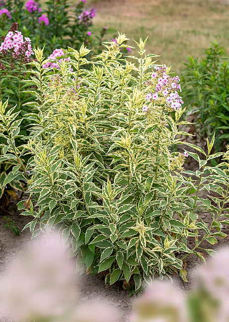 Eigenschaften: Flammenblume ´Norah Leight´ gehört zu den neuen attraktiven Sorten, die sich durch interessante bunte Blätter auszeichnen. Über den cremegrünen Blättern blühen ab Beginn des Sommers weiße Blüten mit deutlich rosafarbenem Auge. Flammenblume ist eine üppig blühende, krankheitsresistente Staude mit langen, holzigen Stielen. Die Pflanze ist für Schmetterlinge äußerst attraktiv.