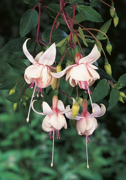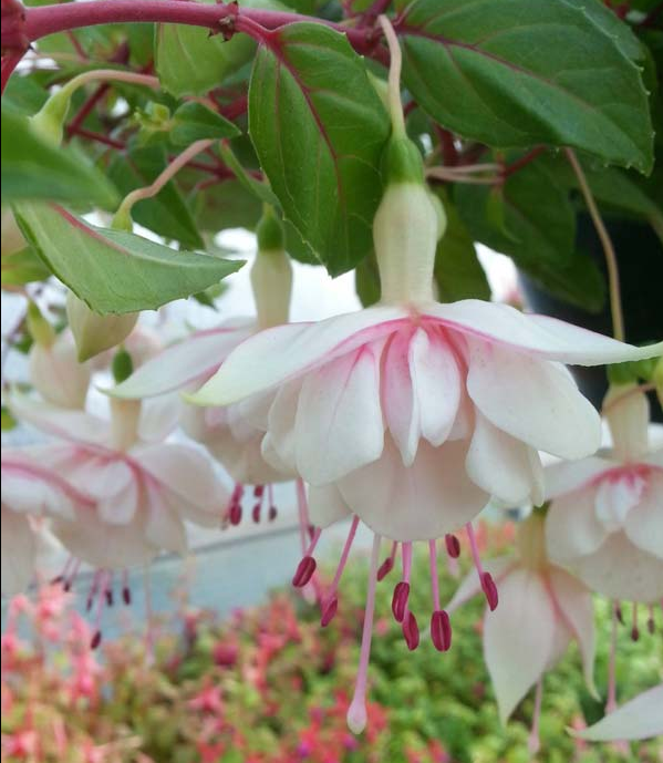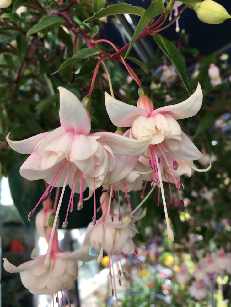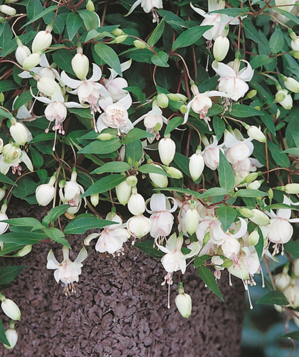 Elegante, hängende Fuchsie mit weißen Blüten und zartrosa Schimmer.
