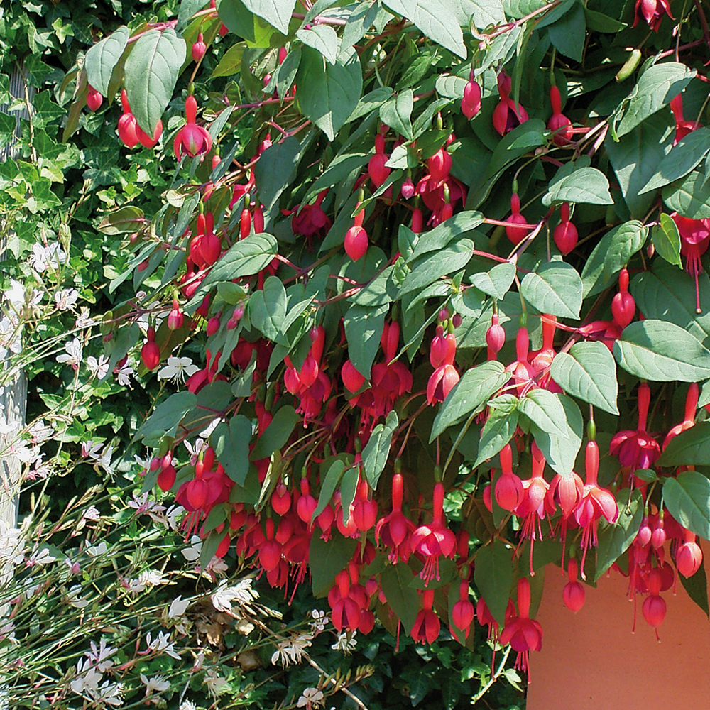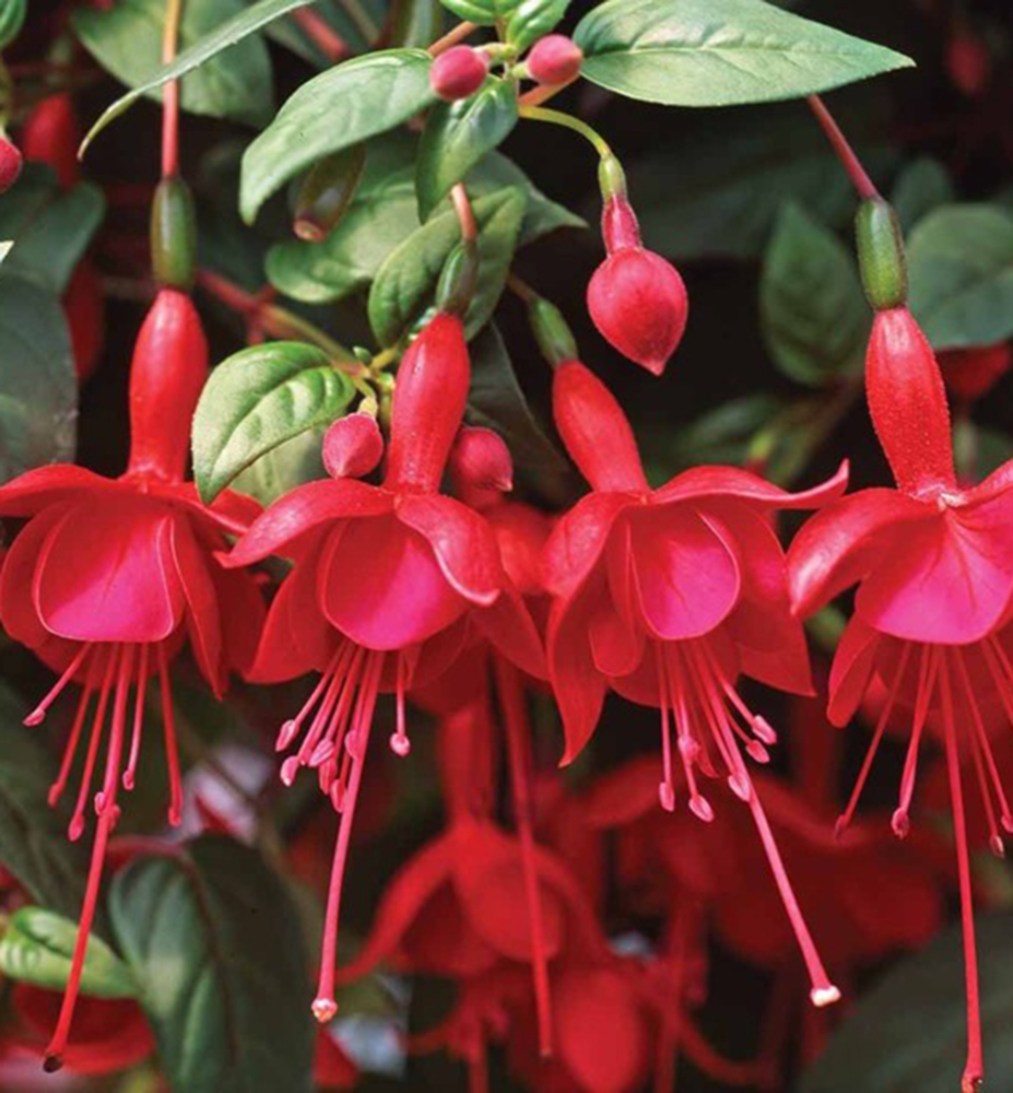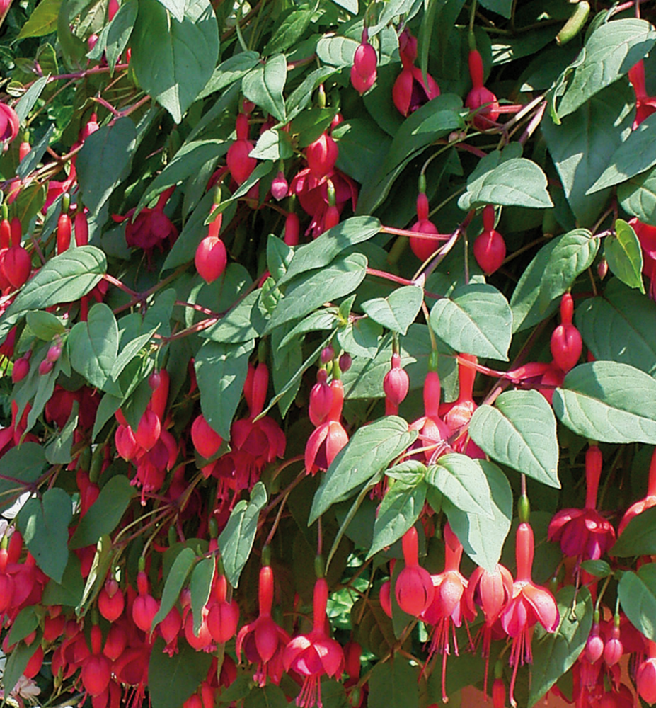 Beliebte hängende Fuchsie mit roten Blüten an zarten Stielen.