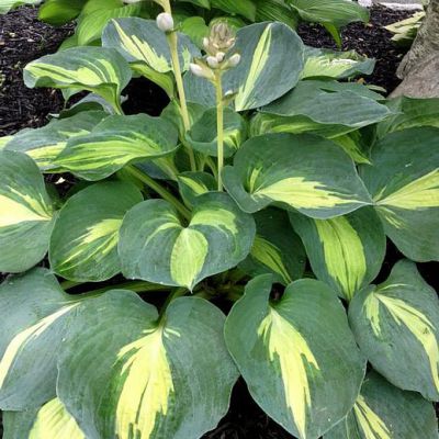 Eine mittelhohe Funkie mit großen blaugrünen Blättern und einem auffälligen cremefarbenen Muster.