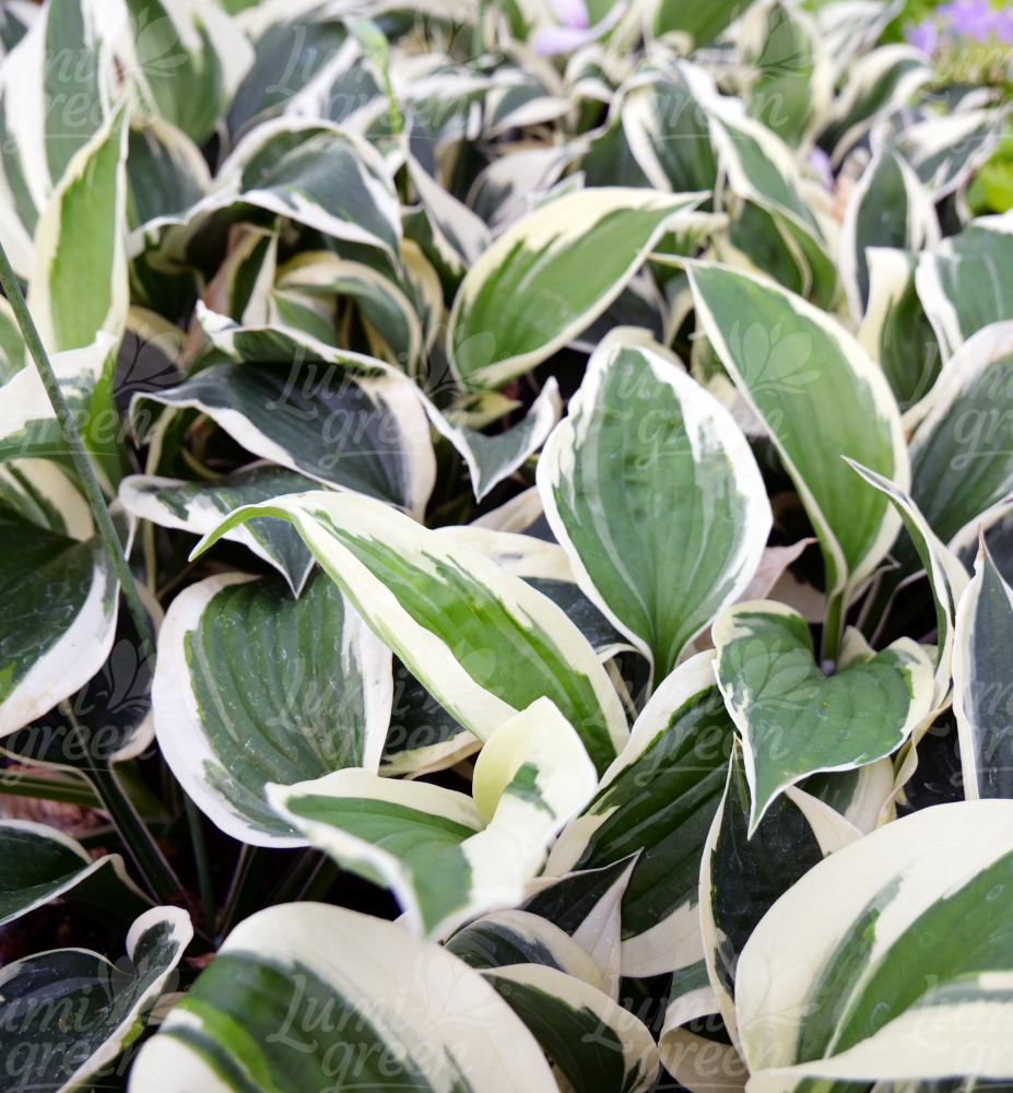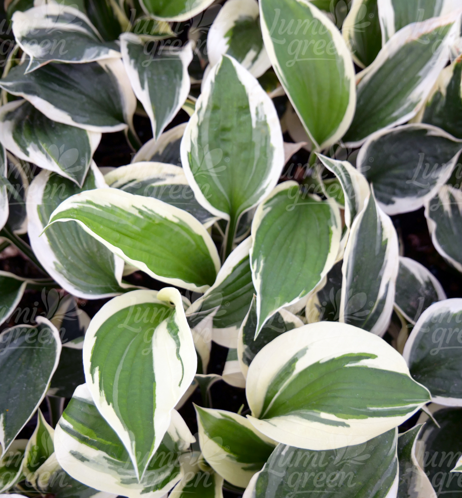 Eine interessante Funkie mit großen Blättern und einem breiten cremeweißen Rand.