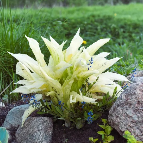 Eigenschaften: Funkie ´WHITE FEATHER´ ist wirklich einzigartig unter den Gästen. Es hat längliche Blätter von weißer bis cremefarbener Farbe, deren Form einer weißen Vogelfeder ähnelt. Sowohl die Blattadern als auch der Blattstiel haben eine zartgrüne Farbe. Im Laufe des Sommers ändert sich die Farbe der Blätter allmählich ins Hellgrün. Die Blüten haben eine lavendelfarbene Farbe. Funkien sind ausgezeichnete Stauden für schattenliebende Beete, wo sie dank ihrer vielfarbigen Blätter farbenfrohe Strukturen bilden.