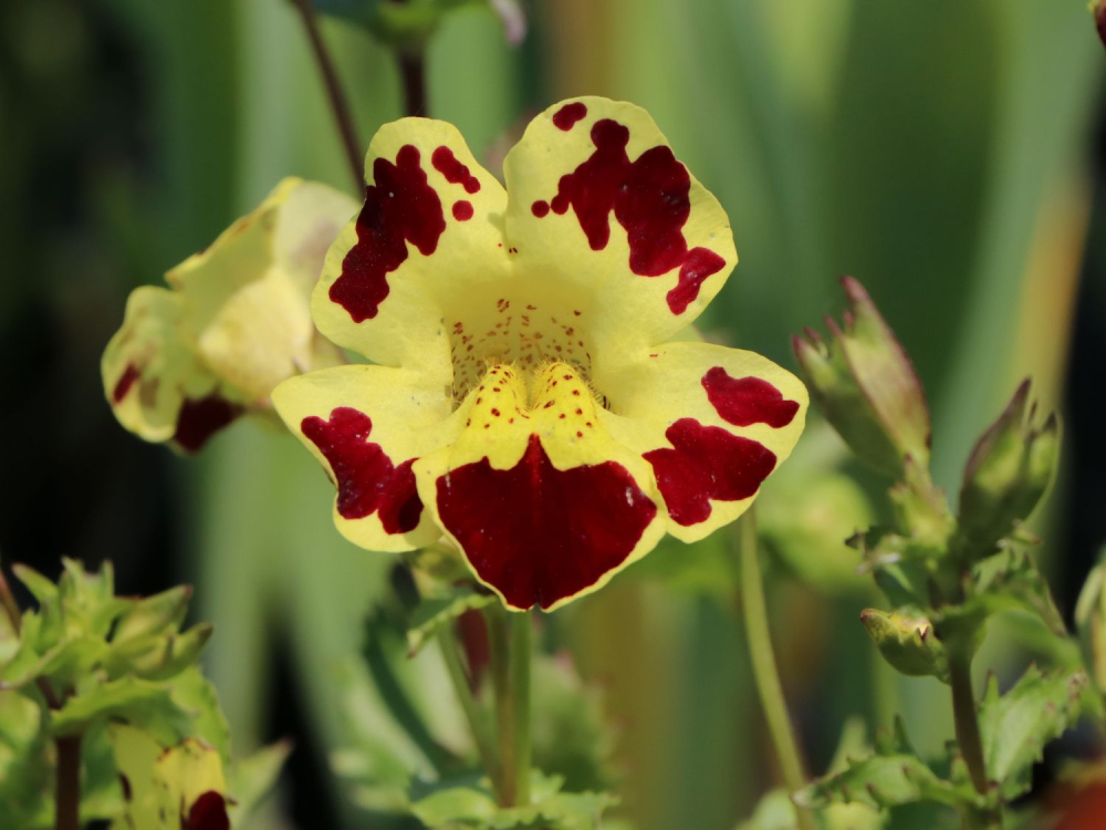 Weit ausladende, feuchtigkeitsliebende Staude mit dekorativen gelben Blüten und roten Flecken.