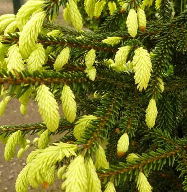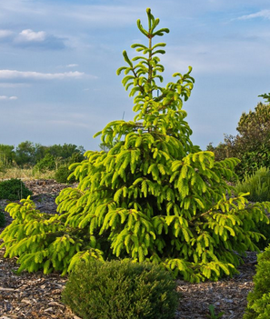 Anbau:Die Ostfichte mag gut durchlässigen, aber leicht feuchten Boden mit ausreichend Nährstoffen. Wir pflanzen es an einem sonnigen Standort, wo die goldgelbe Farbe der jungen Triebe sehr schön zur Geltung kommt.
