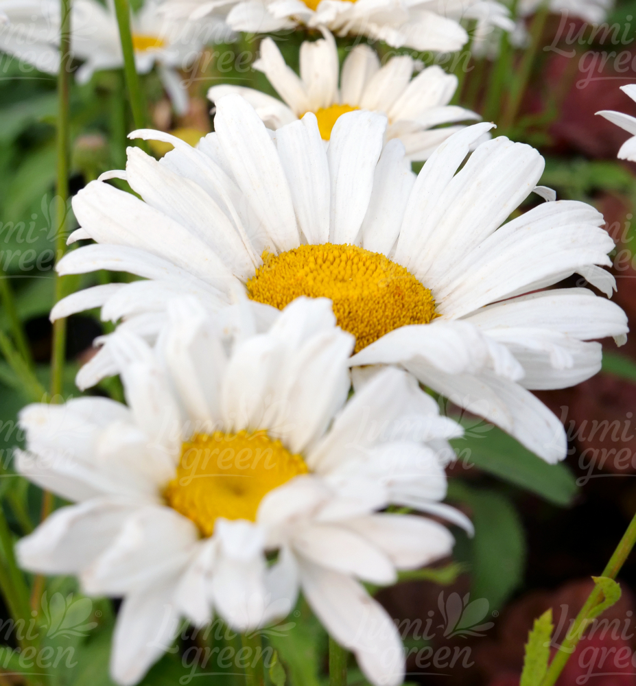 Eine neue, kompakt wachsende Margerite mit robusten, dichten weißen Blüten.