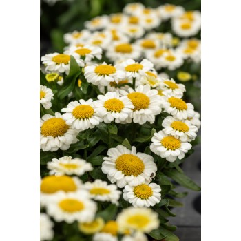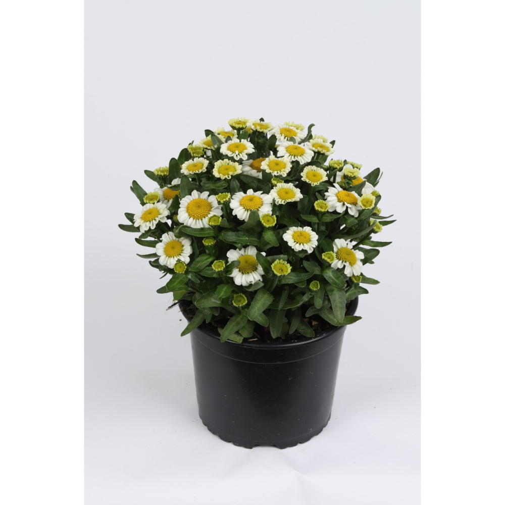 Kompakte Margerite mit robusten weißen Blüten und auffälligem gelbem Zentrum.