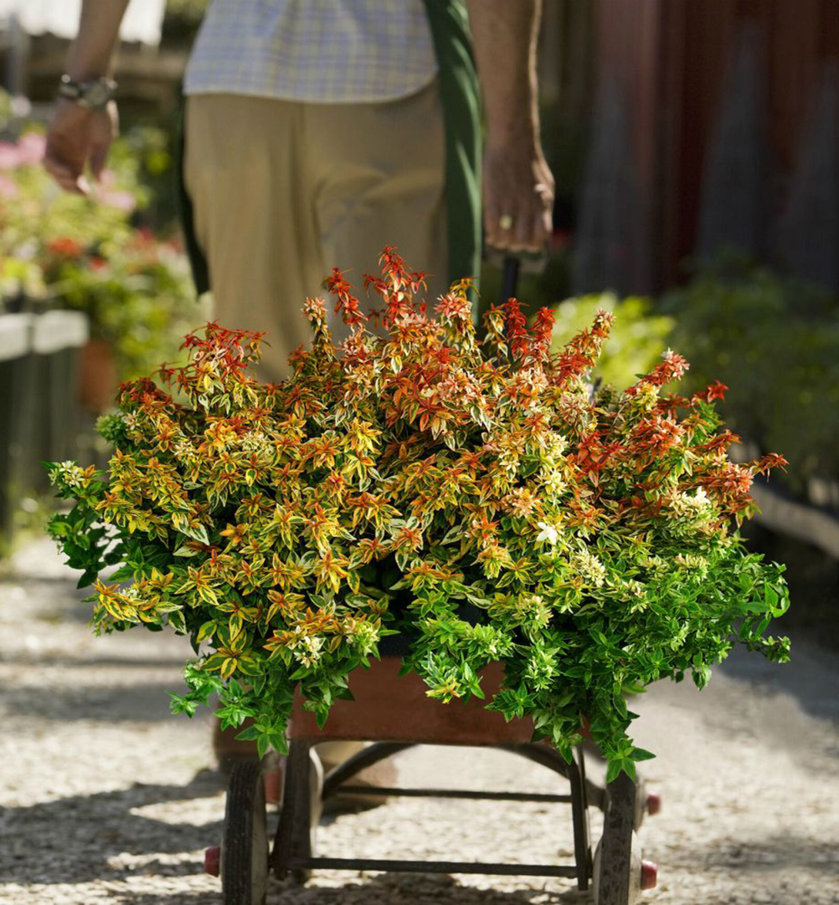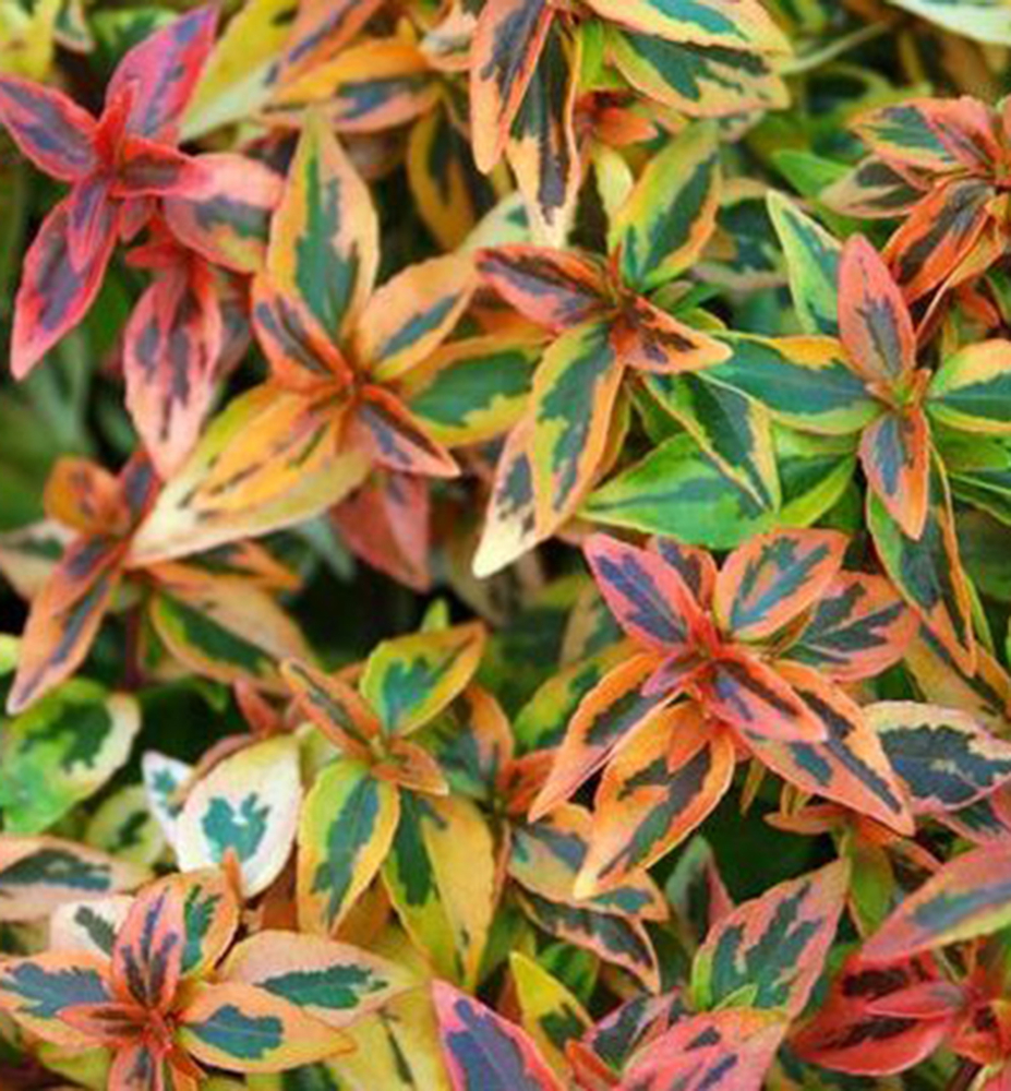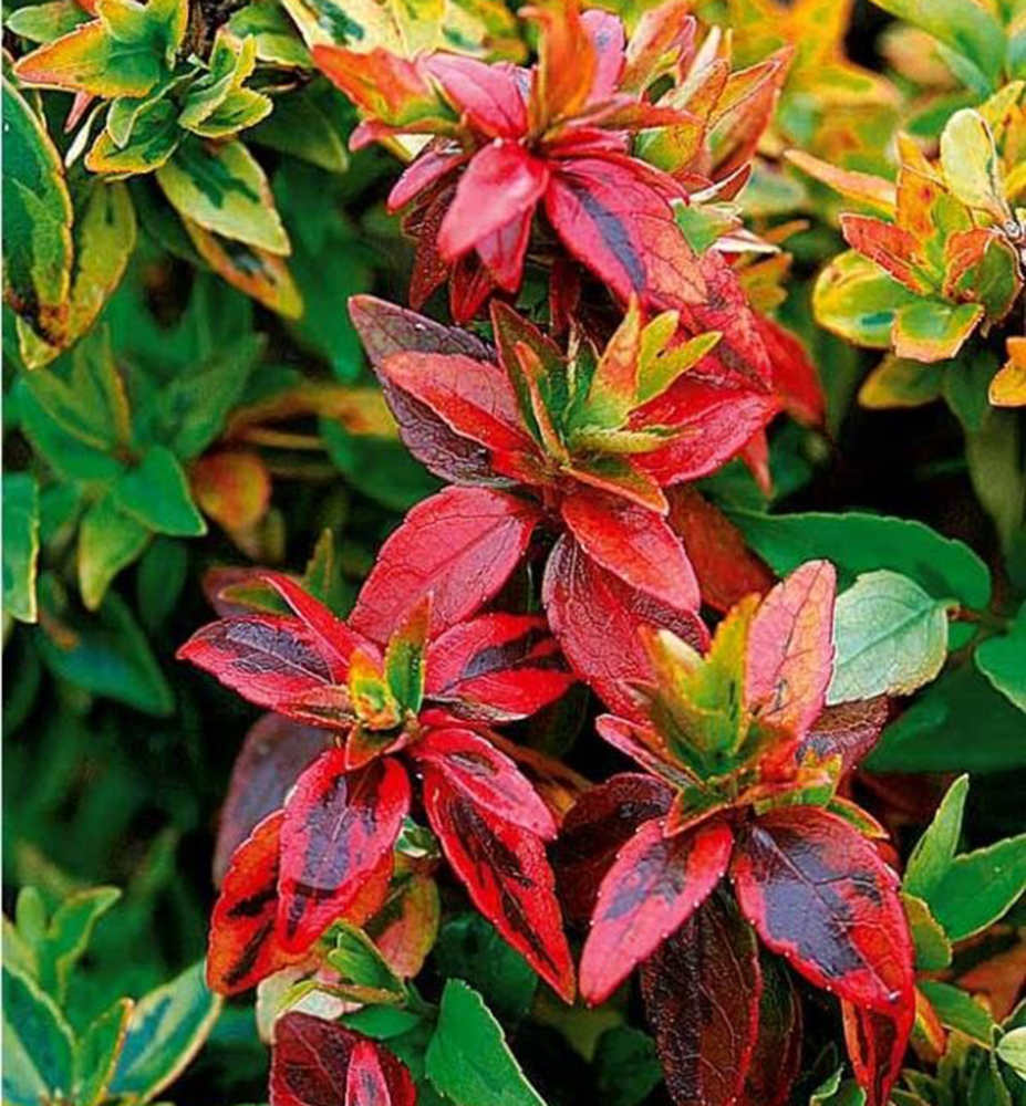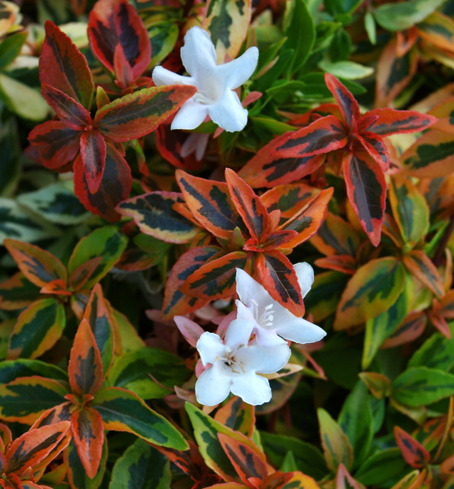 Eigenschaften: Abelie ´KALEIDOSCOPE´ ist ein halblaubabwerfender, niedriger Strauch mit Blättern, die das ganze Jahr über ihre Farbe ändern. Die winzigen, glänzenden Blätter sind im Frühling lindgrün mit leuchtend gelben Rändern, im Sommer goldgelb und im Herbst burgunderrot, orange und rosa. ´KALEIDOSCOPE´ ist die am längsten blühende Abelie-Sorte. Ab Juni entwickeln sich aus rosafarbenen Knospen glockenförmige weiße Blüten, die den Strauch bis Oktober bedecken. Die Pflanze ist frosthart bis -25 °C. Sie eignet sich für kleine Gärten, aber auch für Kübelpflanzungen, und wird oft als informelle Hecke verwendet.