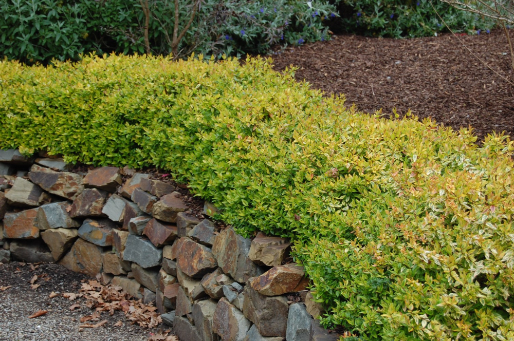 Ein langblühender, niedriger Strauch mit glänzend grünen Blättern und weißen, glockenförmigen Blüten.