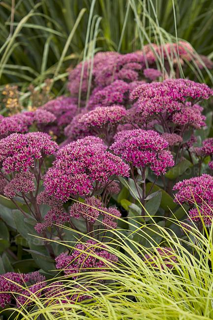 Beeindruckende Herbststaude mit auffälligen rotrosa Blüten und grau-grünen Blättern.