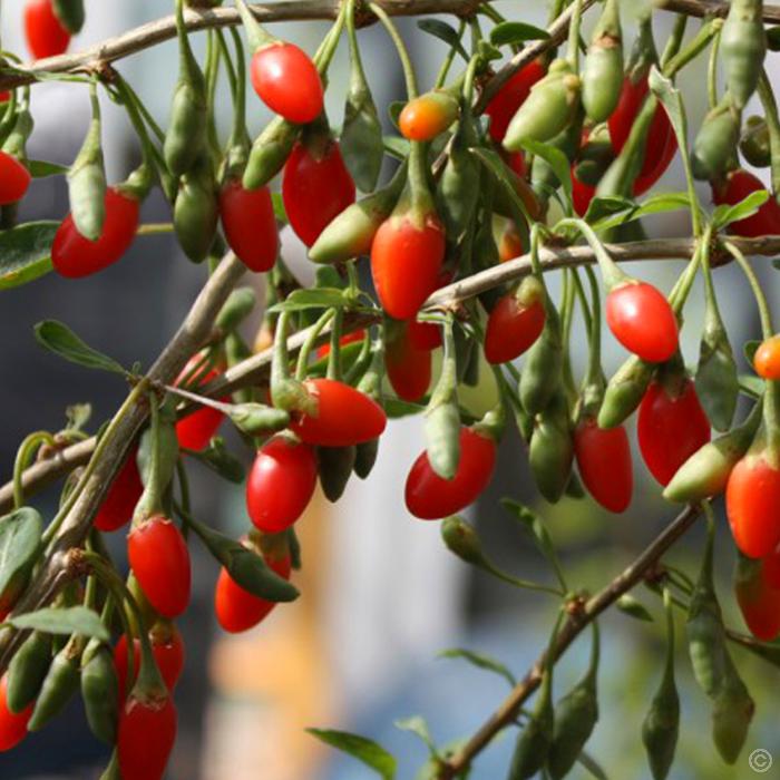 Eigenschaften: Die Goji-Beere ‘INSTANT SUCCESS’ ist ein sommergrüner, schnellwachsender, dorniger Strauch, der ausreichend Platz und einen sonnigen Standort benötigt, damit die Früchte optimal reifen. Sie wächst kompakt und erreicht eine Höhe von etwa 2 m. Die Blüten sind violett, die großen (ca. 2 cm) Beeren leuchtend orangerot und süß im Geschmack. Die Pflanze ist anspruchslos, frosthart und trägt schmackhafte Früchte, die reich an Vitaminen und wichtigen Spurenelementen sind.
