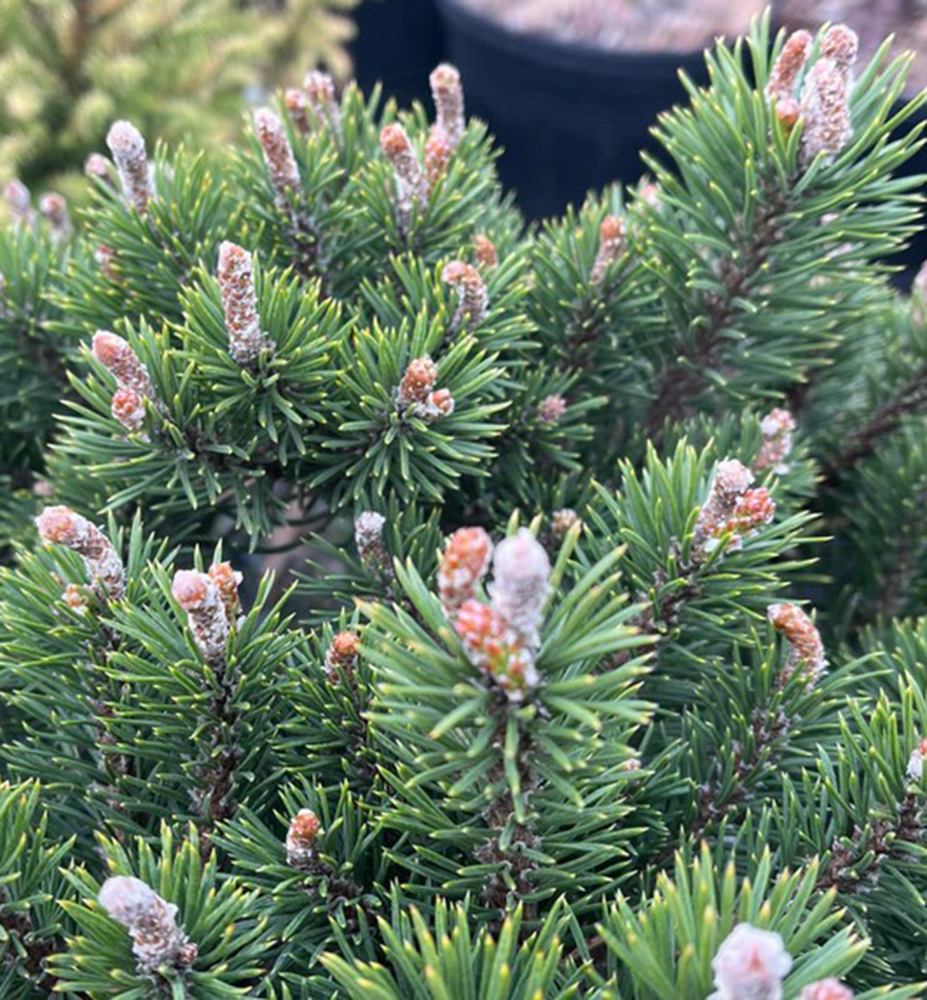 Eine kompakte Kiefer mit dichtem, kugeligem Wuchs und gestreiften jungen Trieben.