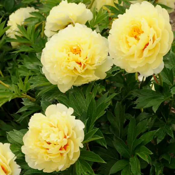 Eigenschaften: Die Halbstrauchige Pfingstrose ist eine interessante interspezifische Hybride, die die Schönheit der Strauchpfingstrose mit den Wuchseigenschaften der Staudenpfingstrose vereint. Die Sorte ´BARTZELLA´ schmückt das Beet im Frühling mit üppigen, großen, halbgefüllten Blüten. Die Blütenfarbe variiert von Hellgelb bis zu einem kräftigen Gelbton, das Zentrum kann burgunderrot gefärbt sein. Die gefiederten Blätter sind dunkelgrün und färben sich im Herbst vor dem Abfallen in attraktive Orange-, Gelb- und Rottöne. Diese Sorte erreicht eine Höhe von 0,5–0,8 m. Die Pflanze zieht sich im Winter vollständig zurück und treibt im zeitigen Frühjahr mit roten Blattknospen erneut aus. Pfingstrosen kommen sowohl in Staudenbeeten als auch als Ergänzung zwischen Sträuchern und Bäumen besonders gut zur Geltung.