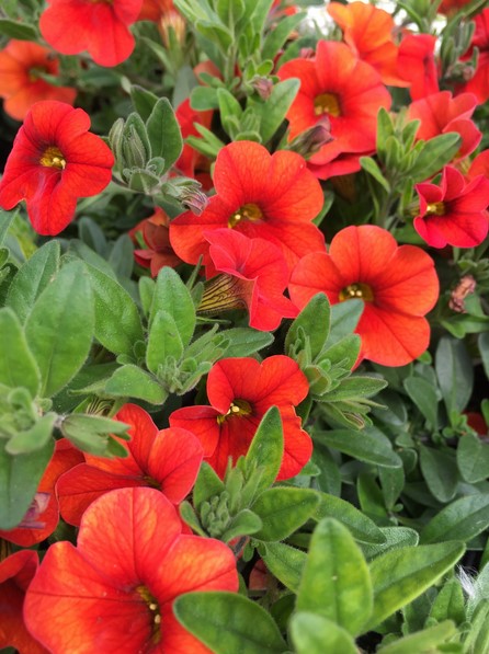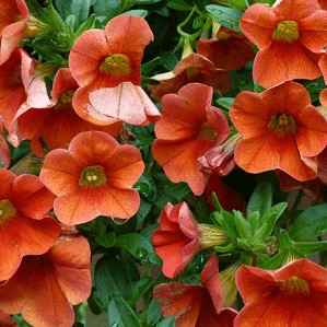 Mini-Petunie mit markanten orangefarbenen Blüten und halbzwergwüchsigem Wuchs.