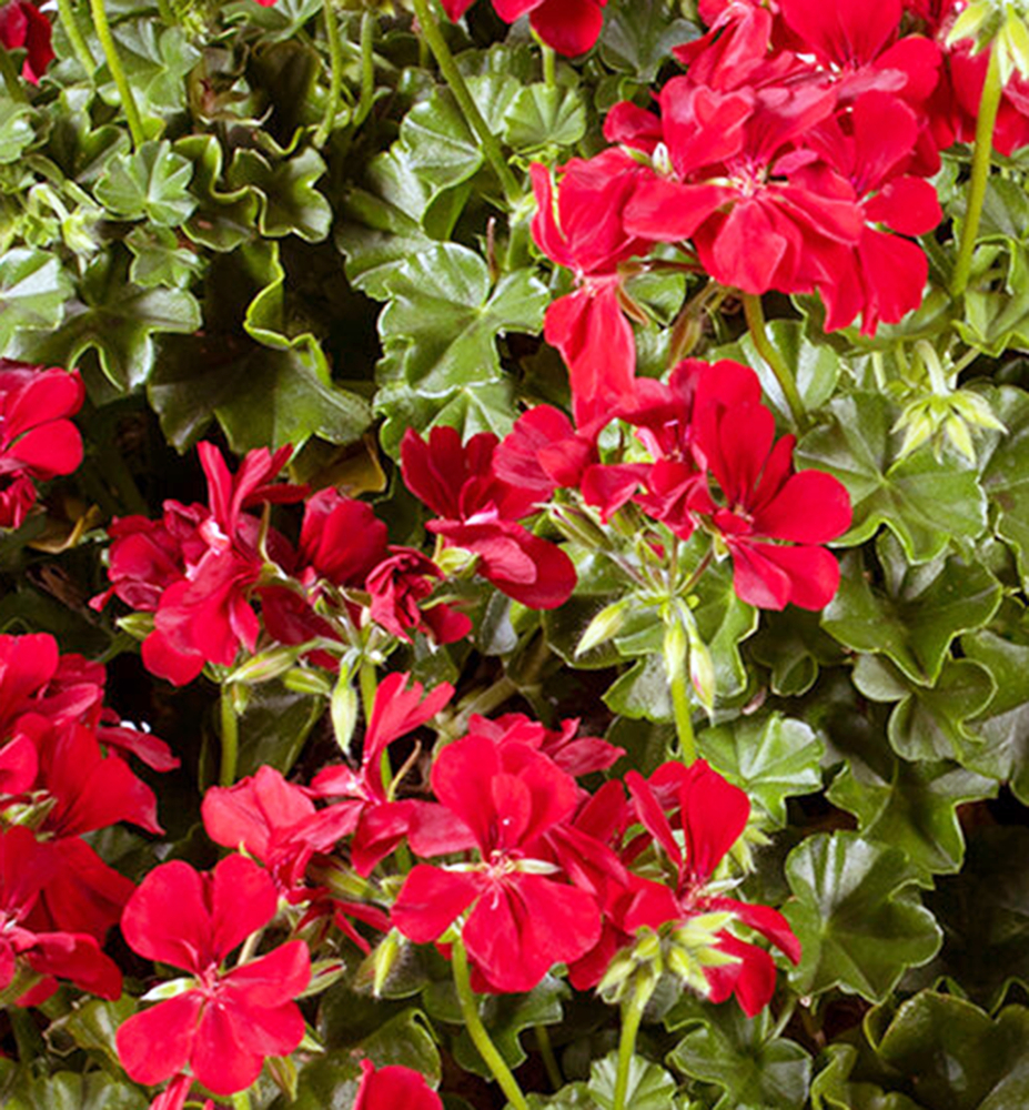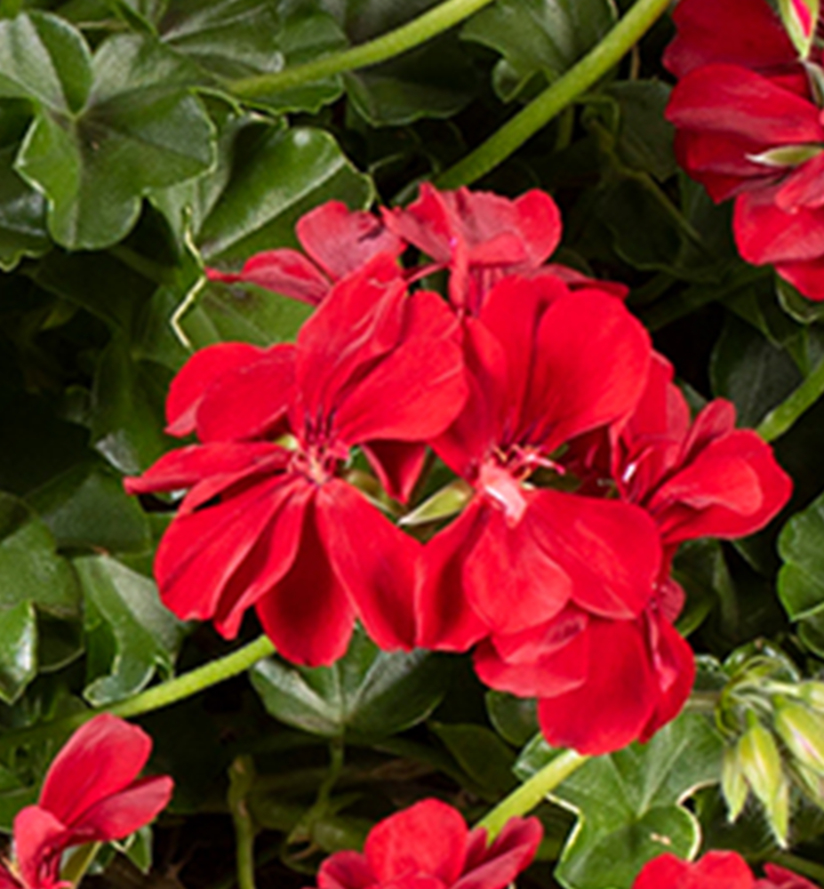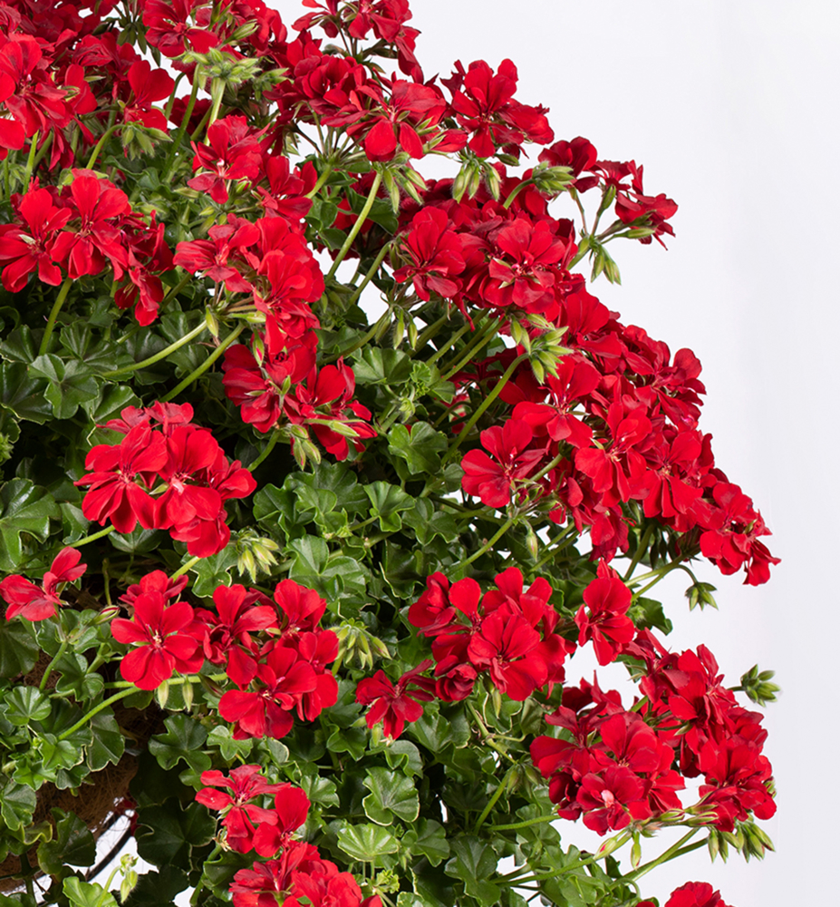Eigenschaften: Hänge-Geranie 'BECKY' ist eine traditionelle Sorte mit intensiv roten Blüten, die an längeren Stielen wachsen. Die Blüten sitzen auf einer Basis aus festen, mittelgrünen Blättern. Dank schnellen Wachstums und früher Blüte bilden sie in kurzer Zeit attraktive, überhängende Triebe, die Balkone und Terrassen während der gesamten Saison schmücken.