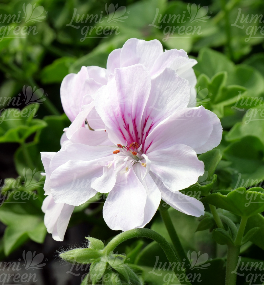 Hängegeranie mit halbgefüllten Blüten und rosa Staubgefäßen.