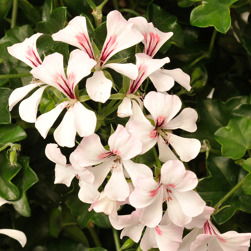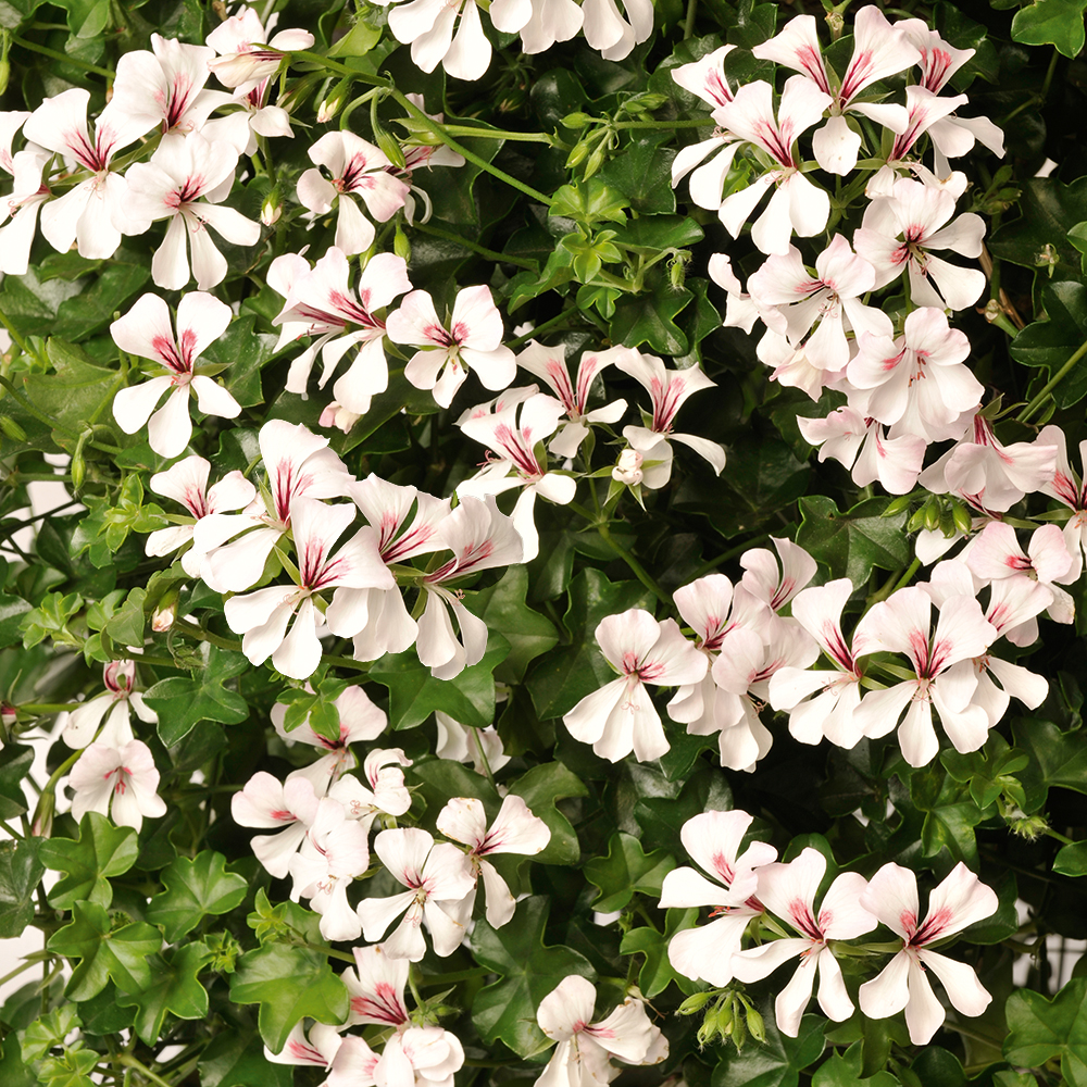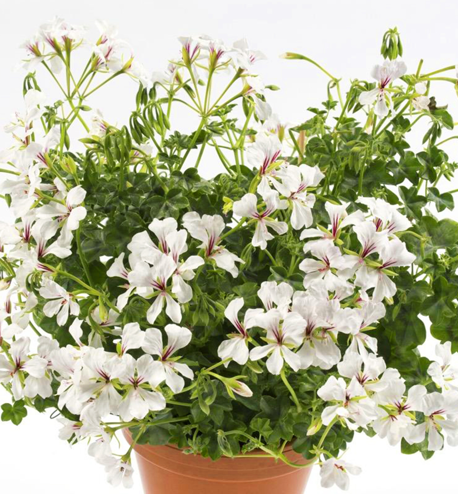 Eigenschaften: Die Geranie ´VILLE DE DRESDEN´ blüht mit zahlreichen Blüten an langen, überhängenden Trieben. Die einfachen weißen Blüten haben einen zarten Hauch von Rosa. Die Grundgruppe der Geranien ‚VILLE‘ zeichnet sich durch ihren hängenden Wuchs sowie einen Selbstreinigungseffekt nach der Blüte aus. Sie ist die am weitesten verbreitete Gruppe der auf dem Markt erhältlichen Geranien.