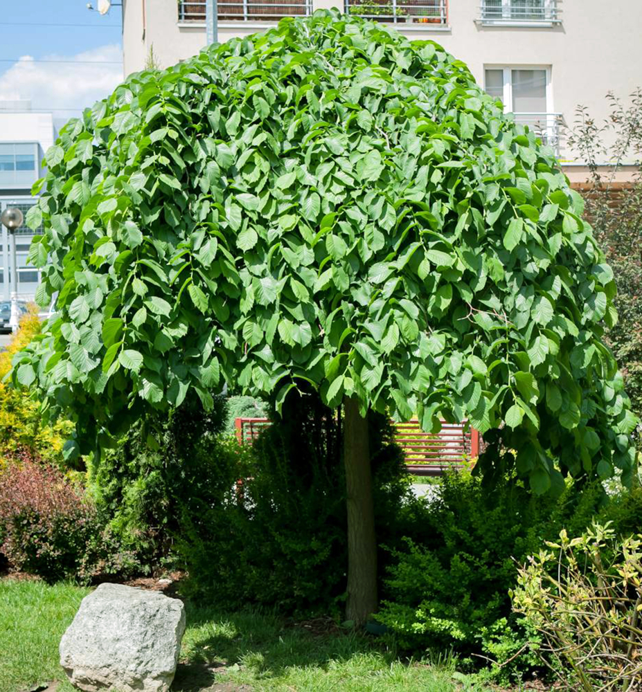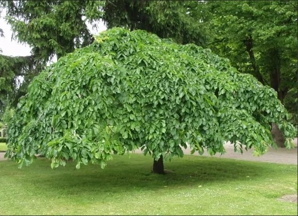Eigenschaften:Bergulme „CAMPERDOWNII“ ist ein dekorativer Laubbaum mit malerisch überhängenden Trieben, die eine kuppelförmige Krone bilden. Sie kann eine Breite von 3 – 6 m erreichen, wobei die Triebe den Boden berühren können. Es hat relativ große Blätter (10–20 cm) von tiefgrüner Farbe mit einem gezackten Rand. Im Herbst nehmen sie einen goldgelben Farbton an. Im Frühling blüht es mit unscheinbaren Blüten, die in Büscheln wachsen. Im Herbst bilden sie interessante Früchte. Die Bergulme „CAMPERDOWNII“ wurde in den 1850er Jahren in Schottland entdeckt.