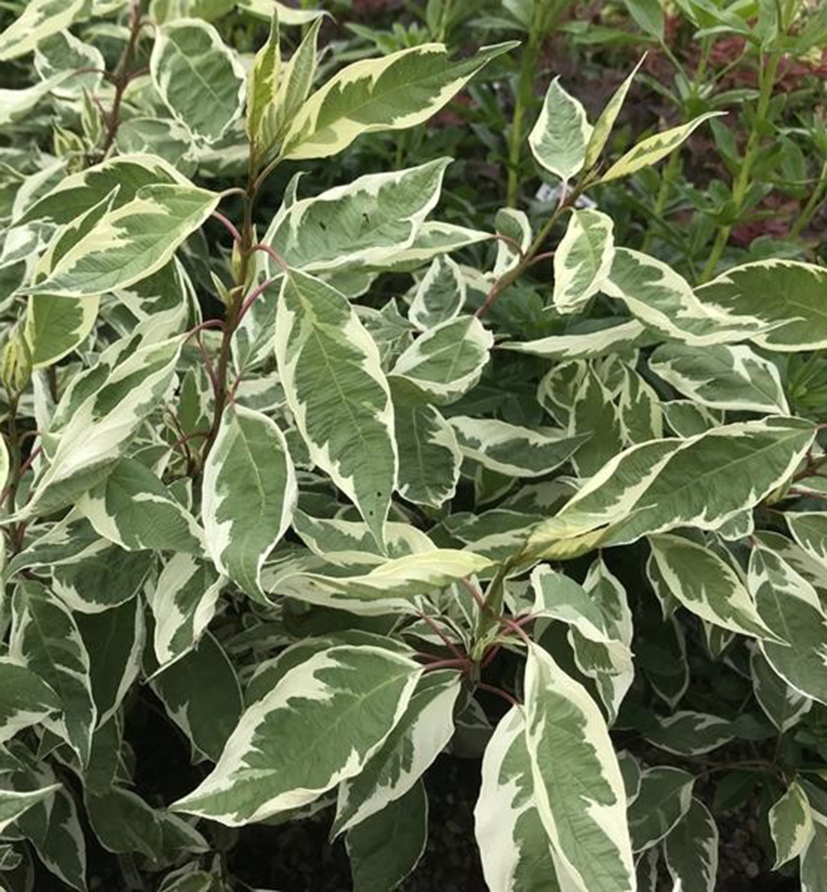 Spektakulärer Hartriegel mit weiß-bunten Blättern und roten Stielen.