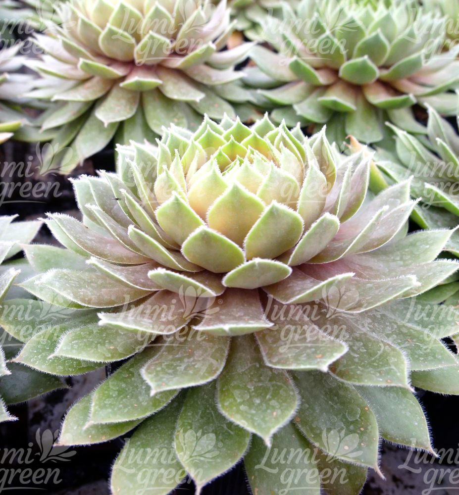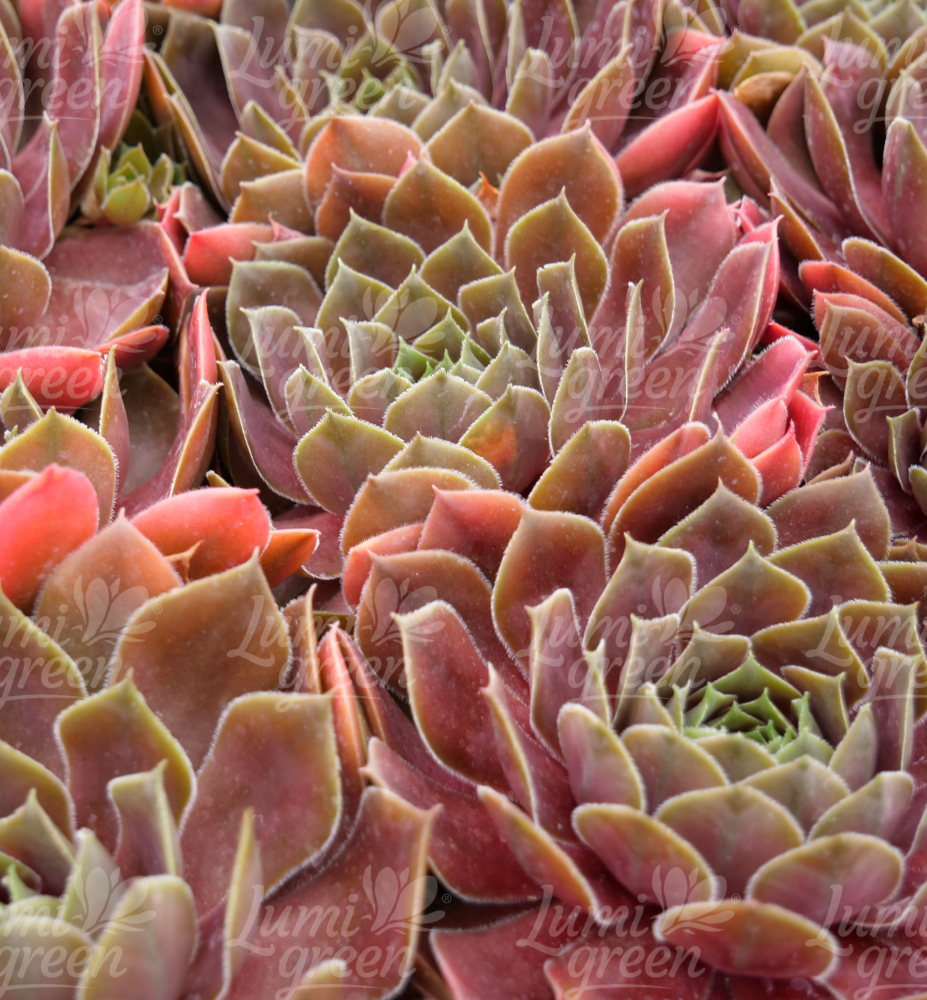 Eigenschaften: Die neue Hauswurz-Sorte ´RUBY STAR´ bildet zahlreiche mittelgroße Rosetten, die metallisch-grün mit einem zarten Rosaschimmer gefärbt sind. Im Laufe der Saison nehmen die Blätter eine rubinrote Färbung an. Im Juni und Juli erscheinen gelbe Blüten auf etwa 10 cm langen Stielen. Durch die unterschiedlichen Färbungen der Rosetten entstehen interessante Mosaike.