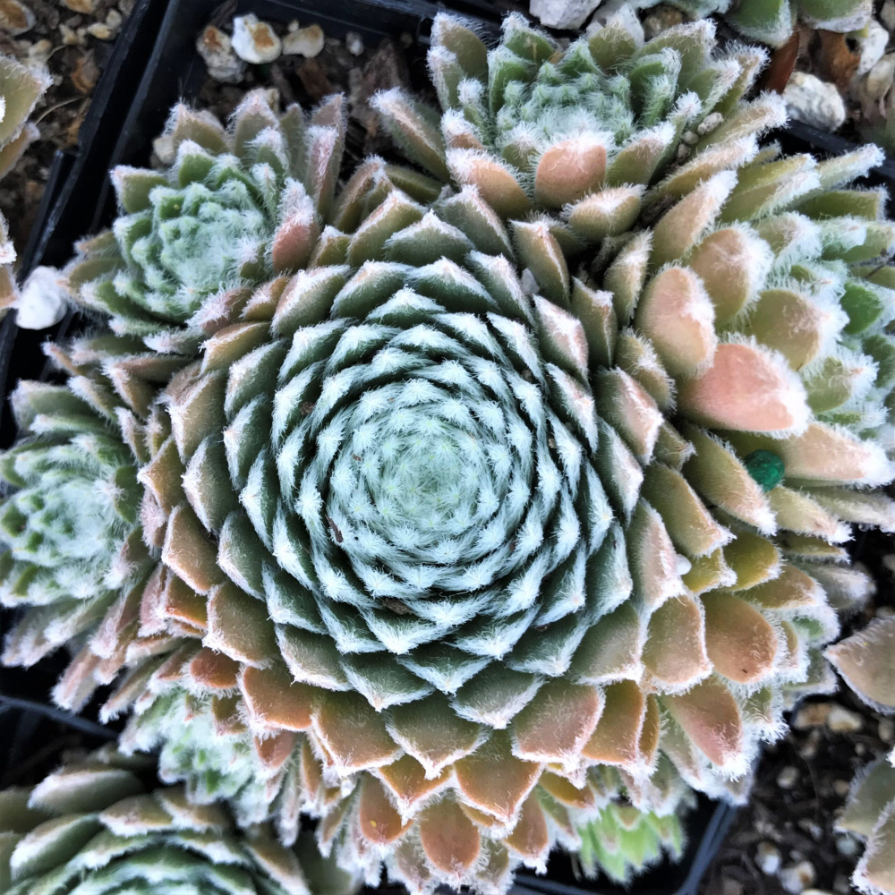 Eine ungewöhnliche Steinpflanze mit grau-rosa fleischigen Blättern und weißen Haaren.