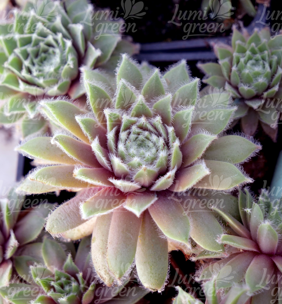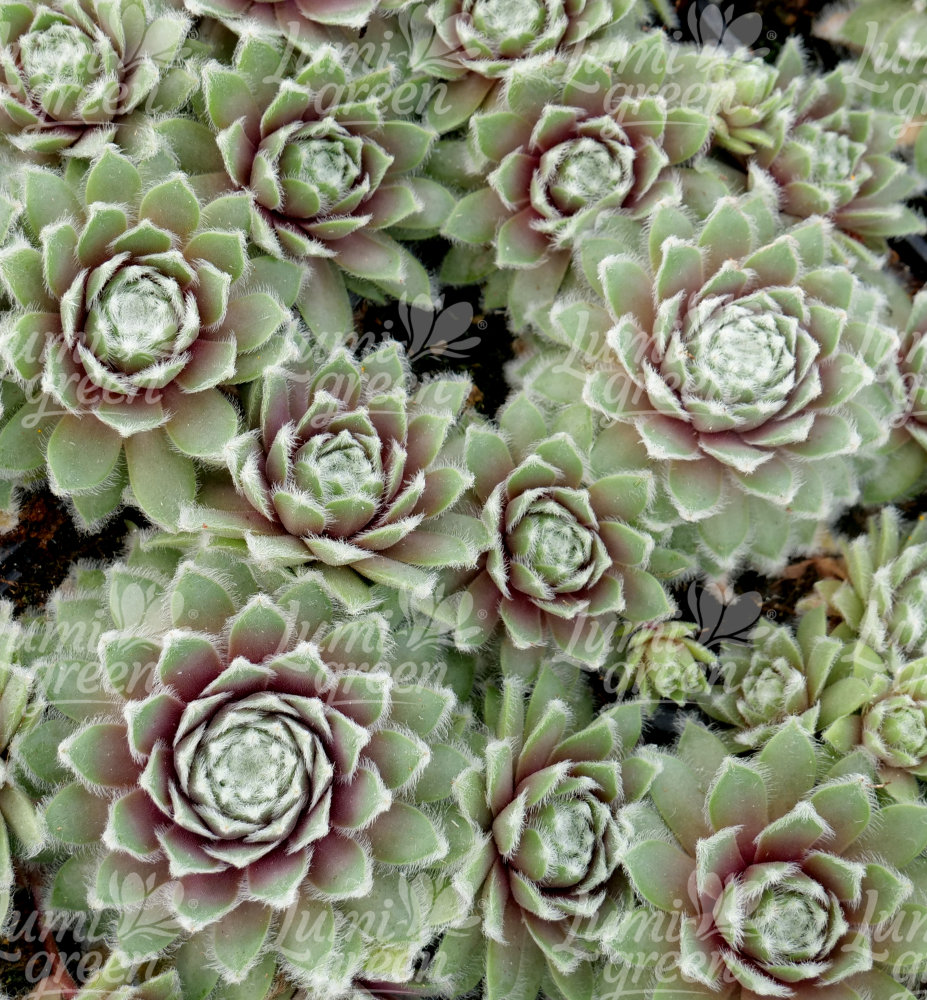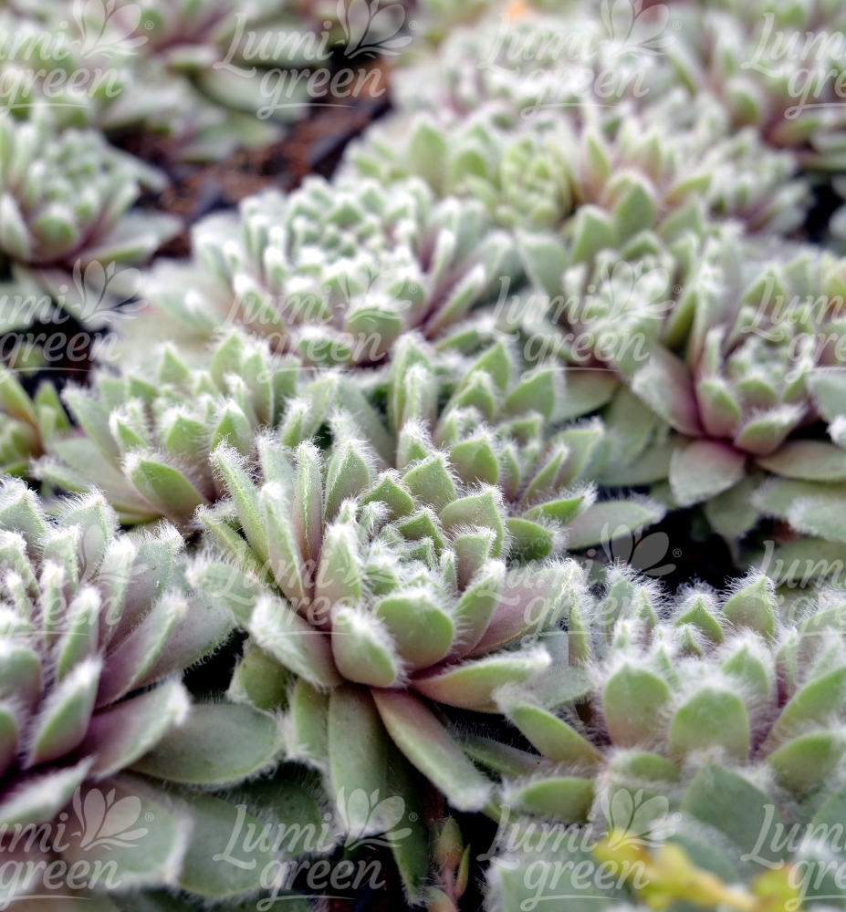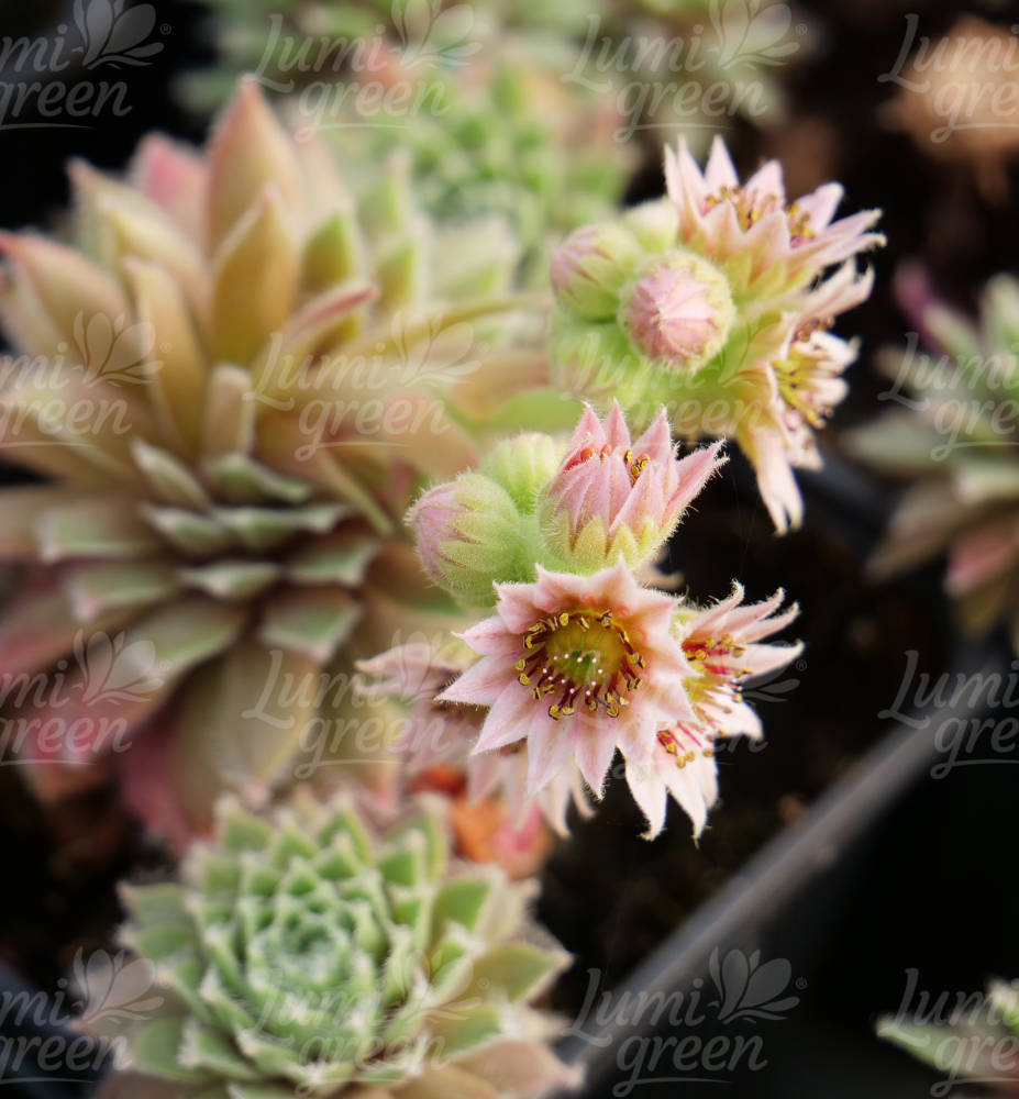 Eigenschaften: Die Hauswurz-Sorte ´Rosa Mädchen´ bildet im Frühling rosa Rosetten, die sich im Sommer allmählich zu bernstein-grün färben. Die Rosetten sind mit feinen Härchen versehen, die an Eiskristalle erinnern. Die Blüten sind besonders attraktiv: hellrosa mit einem dunklen Ring in der Mitte.