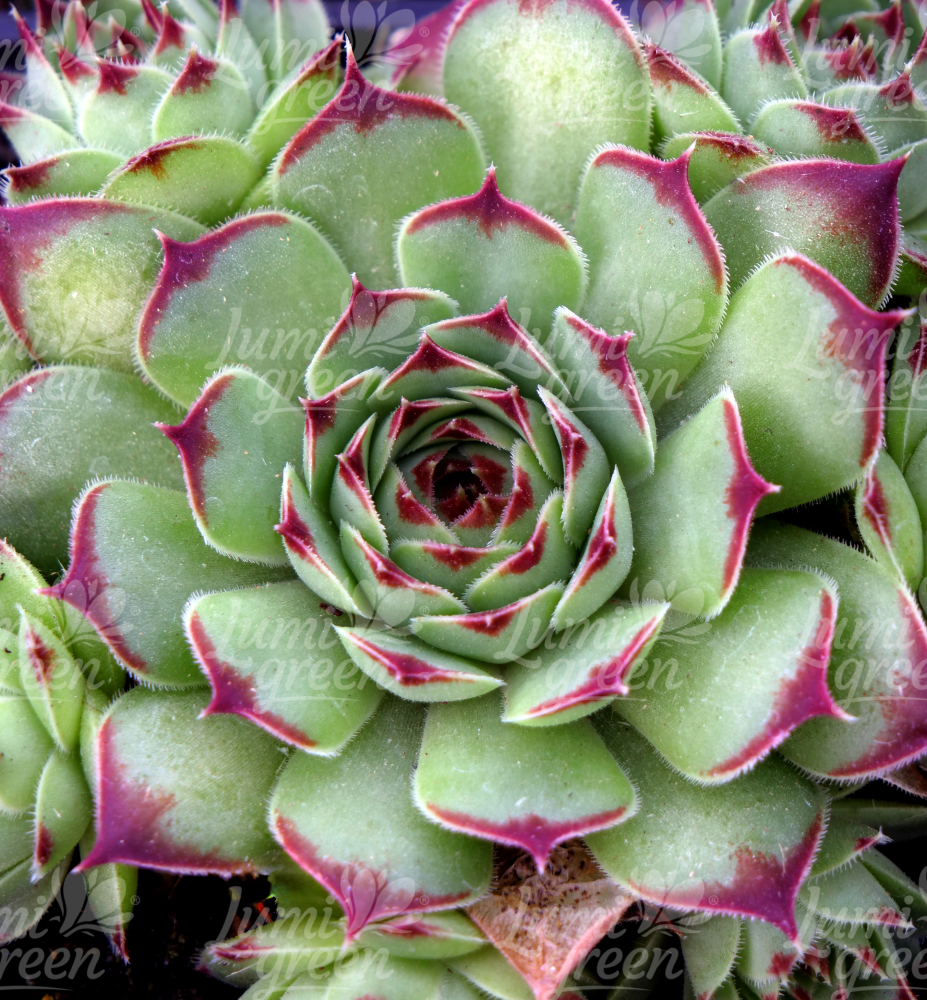 Eine auffällige zweifarbige grüne Hauswurz mit dunklen Spitzen.