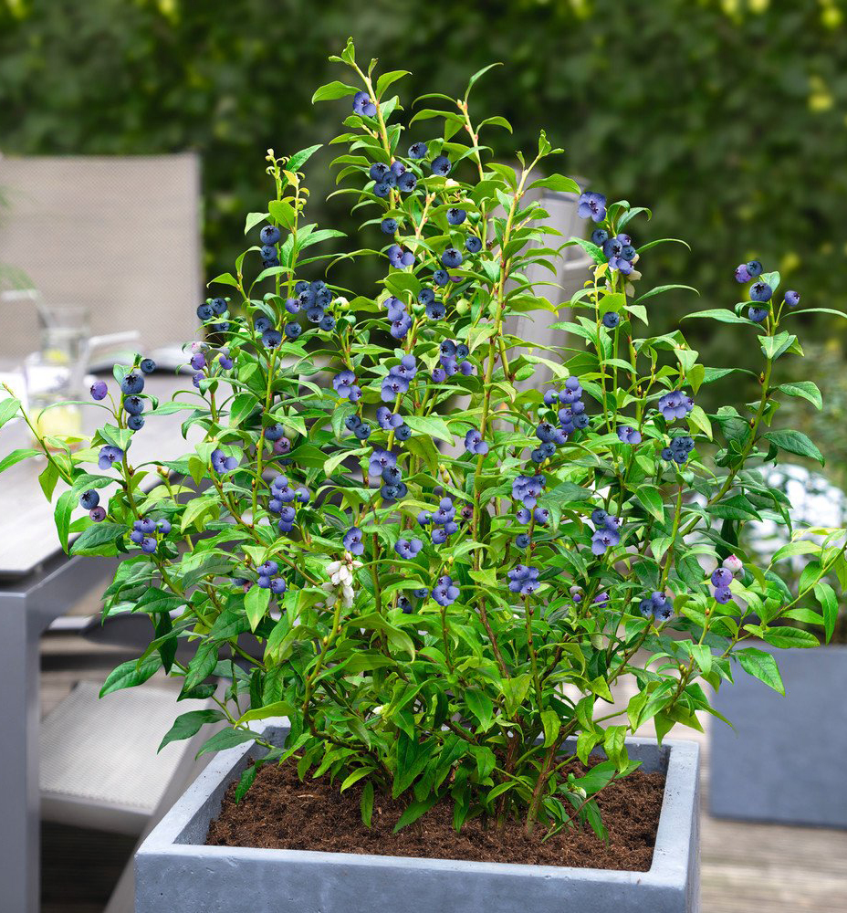 Immertragende Heidelbeere mit Ernte über die gesamte Saison, ideal für den Anbau im Topf.