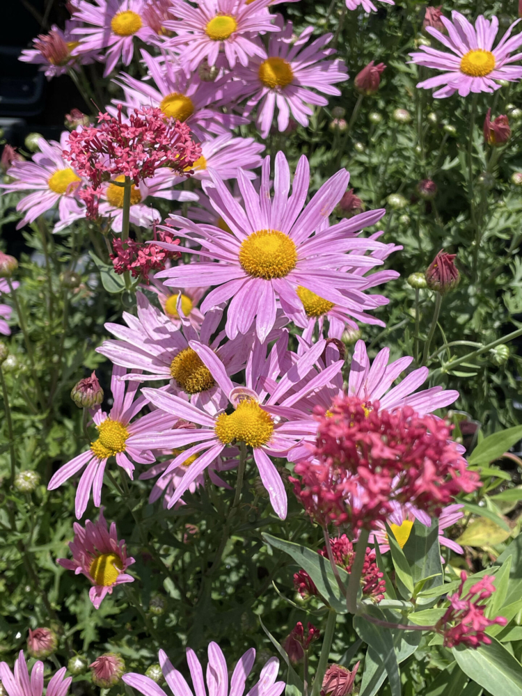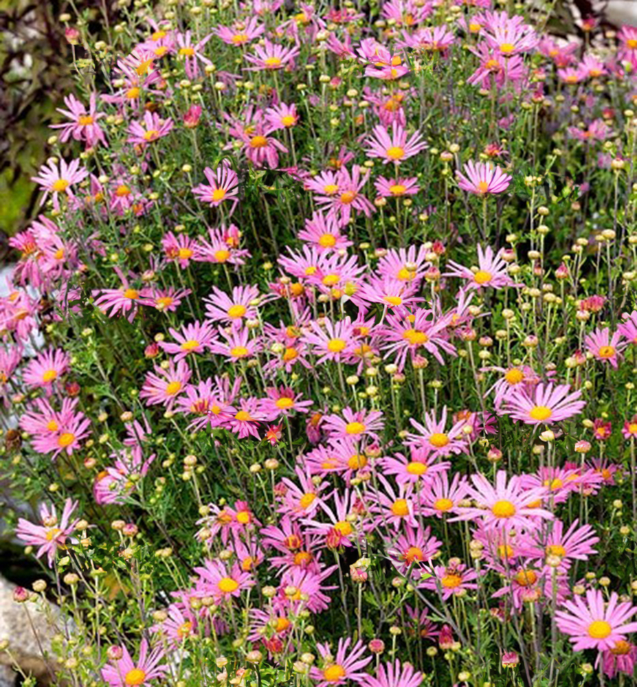 Reich blühende Herbststaude mit hellrosa Blüten und gelber Mitte.