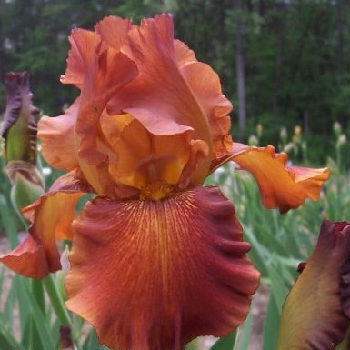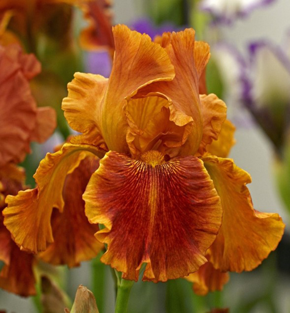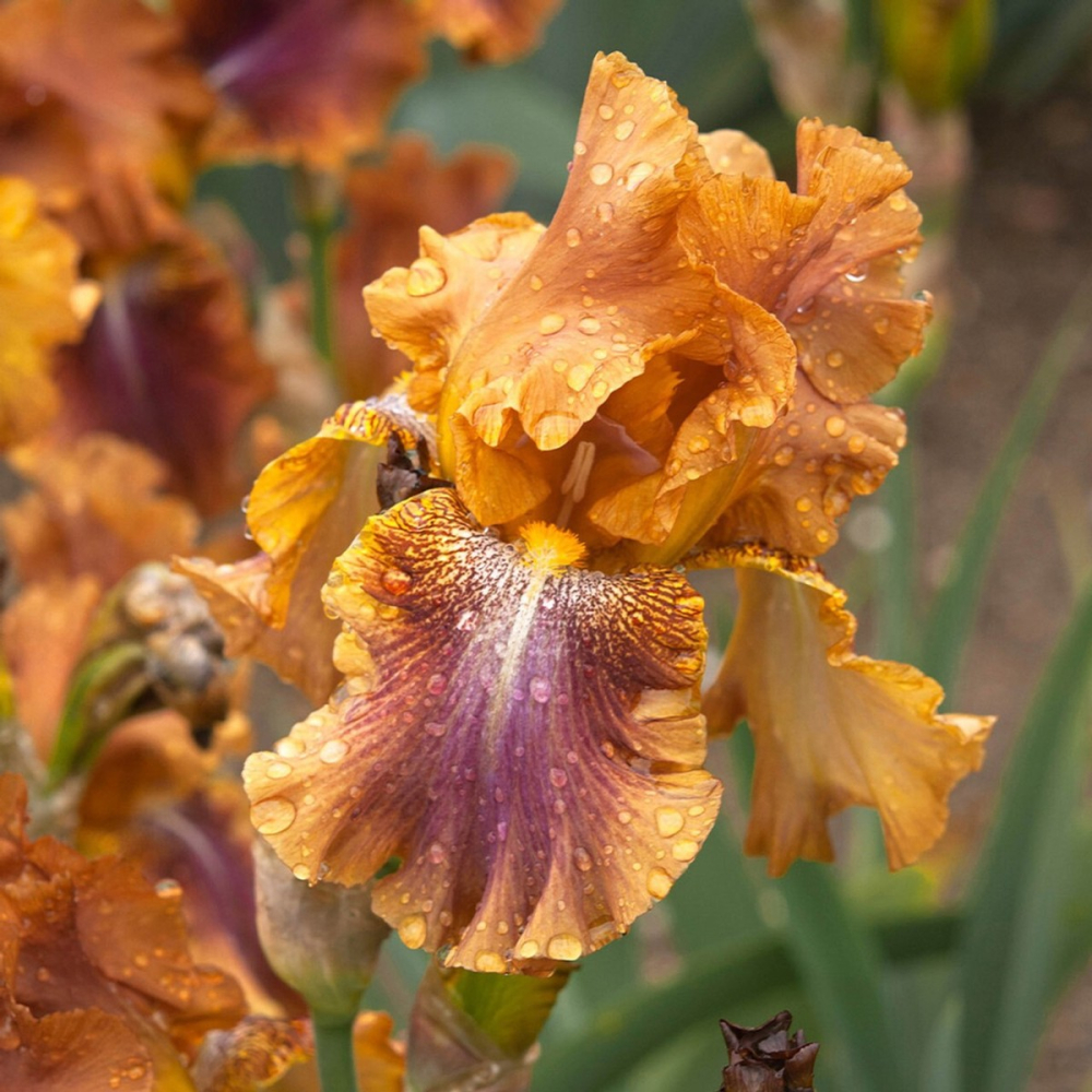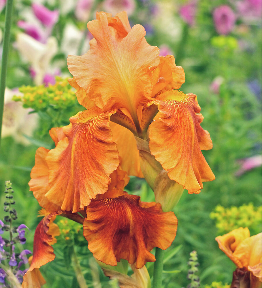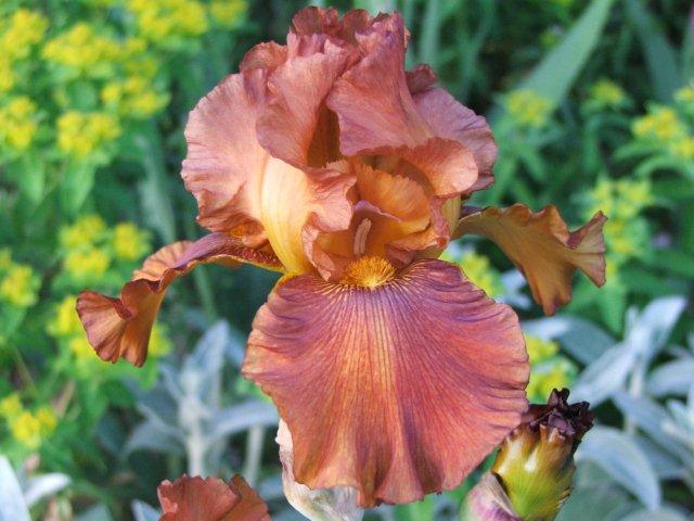 Eine hochwachsende Bart-Schwertlilie in auffälligen kupferorangen Farbtönen.