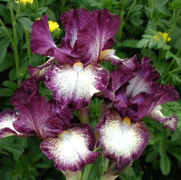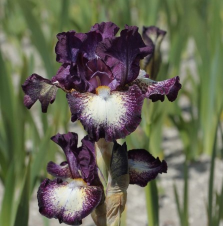 Eigenschaften: Die Sorte 'PRINCE OF BURGUNDY' ist eine mittelhohe Schwertlilie, die kompakte Büschel graugrüner, schwertförmiger Blätter bildet. Sie blüht im Frühsommer, von Mai bis Juni. Die Blüten sitzen auf aufrechten Stielen von 50–60 cm Höhe und zeigen markante dunkelviolette Farbtöne mit kontrastreicher weißer Mitte. Ein charakteristisches Merkmal sind die weißen Bärte mit einem dezenten Gelbstich.