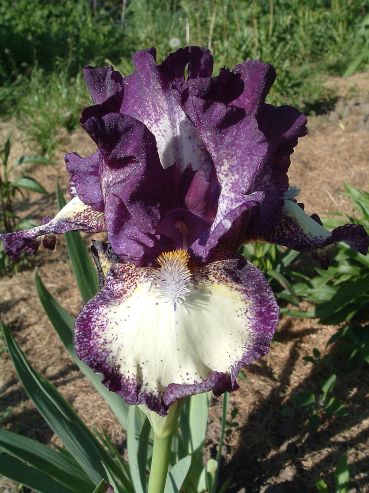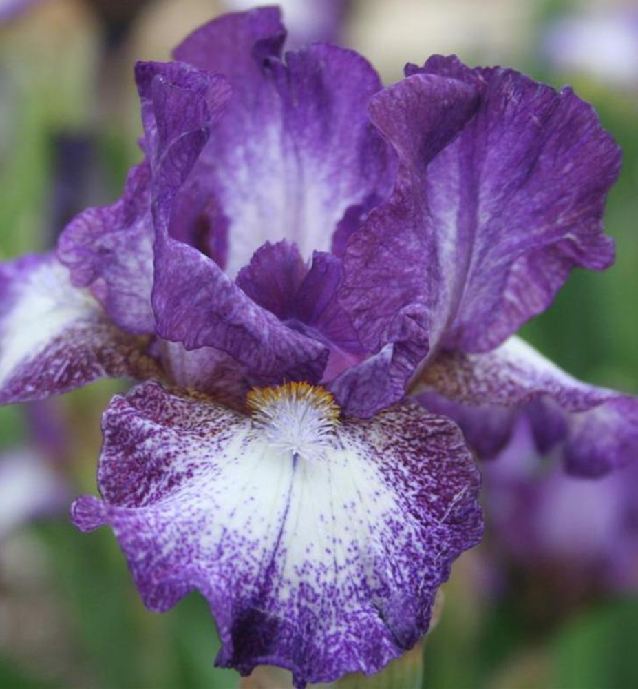 Eine auffällige, mittelhohe Bart-Schwertlilie mit zweifarbigen, violett-weißen Blüten.