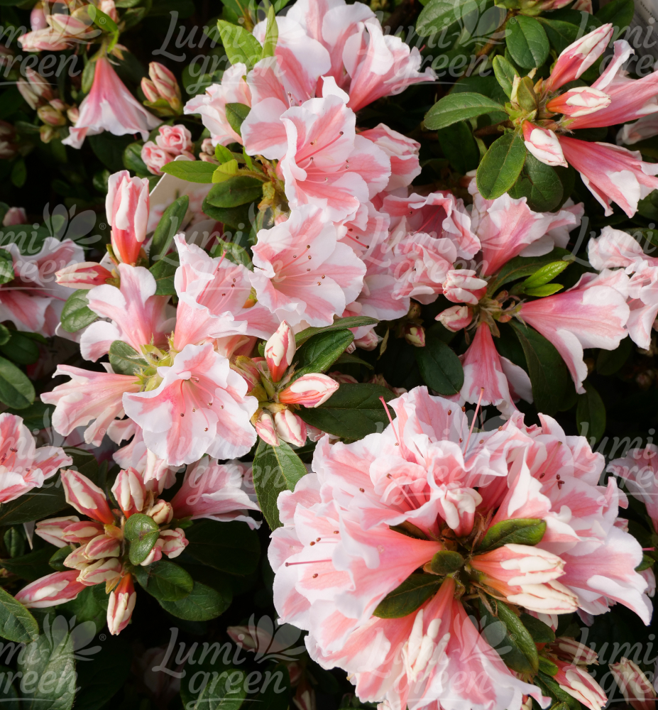 Eine remontierende Azalee mit korallenrosa Blüten und weißem Rand.