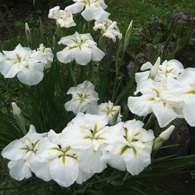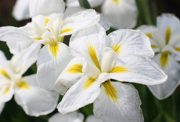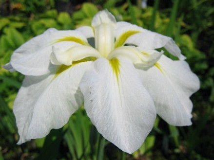 Merkmale: Die Sorte ´GOLDBOUND´ zeichnet sich durch die abgeflachte Form ihrer Blüten aus. Ab Juni bilden sich an aufrecht stehenden Stielen große, schneeweiße Blüten mit leuchtend gelber Mitte. Die Form der Blüten ist sanft gerundet, was ihnen eine elegante Ausstrahlung verleiht. Die perfekte Erscheinung der Blüten wird durch einen Büschel grasähnlicher Blätter unterstrichen. Japanische Schwertlilien werden gerne nicht nur in der Nähe von Teichen, sondern auch direkt in Teichen gepflanzt. Besonders in Gruppenpflanzungen kommen sie gut zur Geltung.