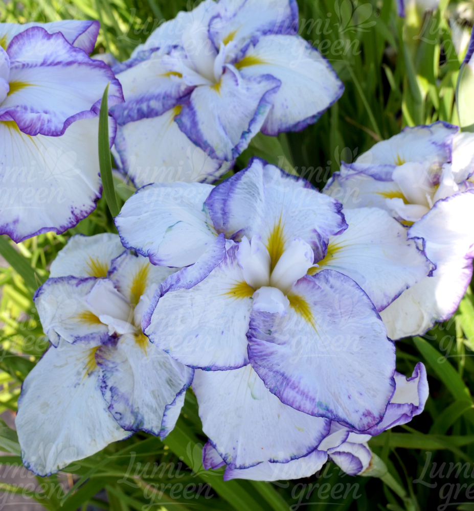 Eigenschaften: Die Japanische Schwertlilie ´LIGHT AT DAWN´ blüht ab Beginn des Sommers mit bis zu 20 cm großen flachen Blüten. Die reinweißen Blütenblätter sind mit einem deutlichen violetten Rand eingefasst, der zudem sehr schön gewellt ist. Die violette Farbe findet sich auch auf den vereinzelten Punkten wieder, die die Oberseite des gesamten Blütenblattes zieren. Ein deutlicher gelber Fleck erstreckt sich in Richtung Kehle. Sie wird 70–90 cm hoch. Die hellgrünen Blätter sind schwertförmig und wachsen aufrecht in einem kompakten Büschel.