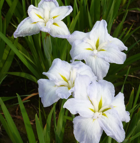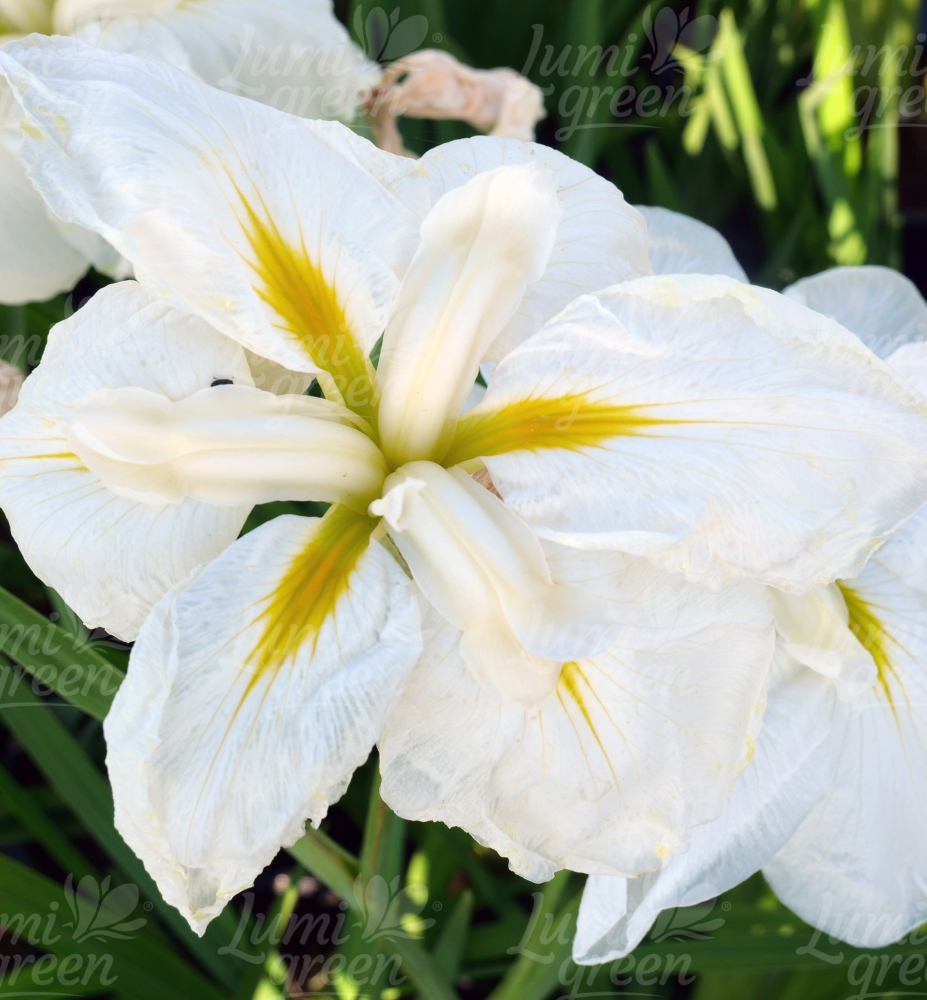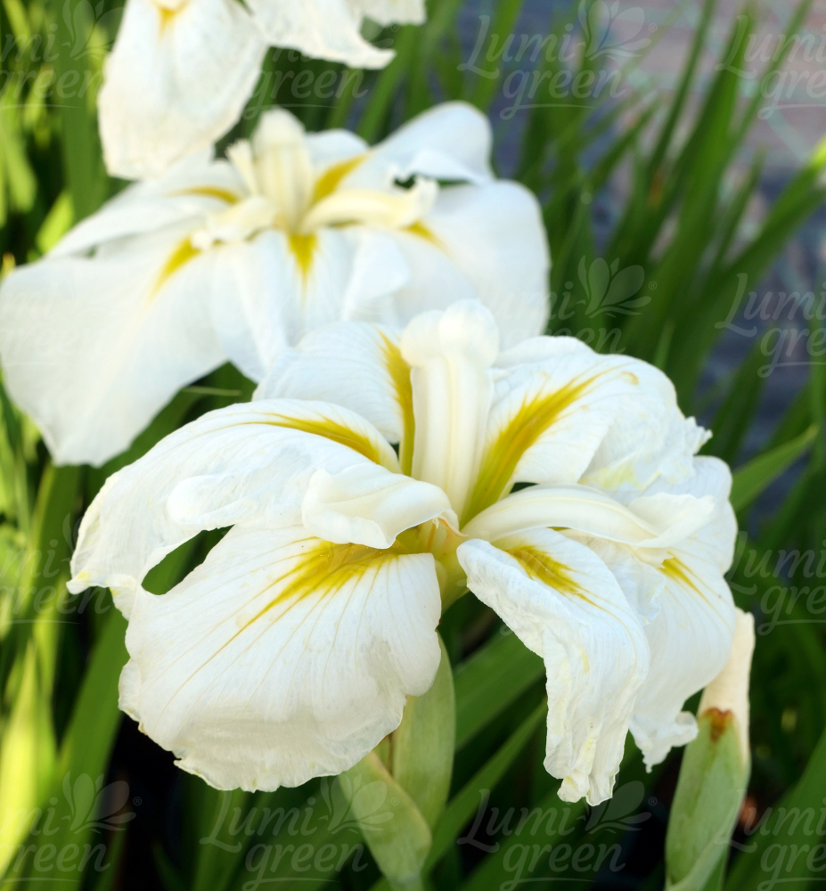 Japanische Iris mit eleganten, abgeflachten Blüten in schneeweißer Farbe.
