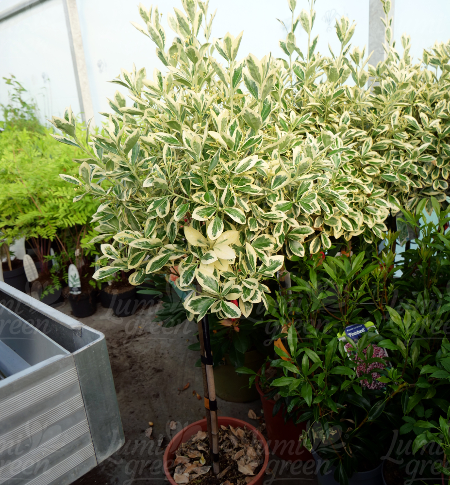 Eigenschaften: Japanischer Spin ´Bravo´ bildet am Stiel eine kompakte halbkugel- bis kugelförmige Krone. Dieser immergrüne, mäßig schnell wachsende Baum ist auch im Winter eine Zierde des Blumenbeets. Die Blätter sind leicht glänzend, oval, grün mit gelbem Rand, 3-4 cm groß. An kalten Tagen verfärben sich die Blätter zart rosa. Auch in einem dekorativen Blumentopf kommt sie sehr schön zur Geltung.