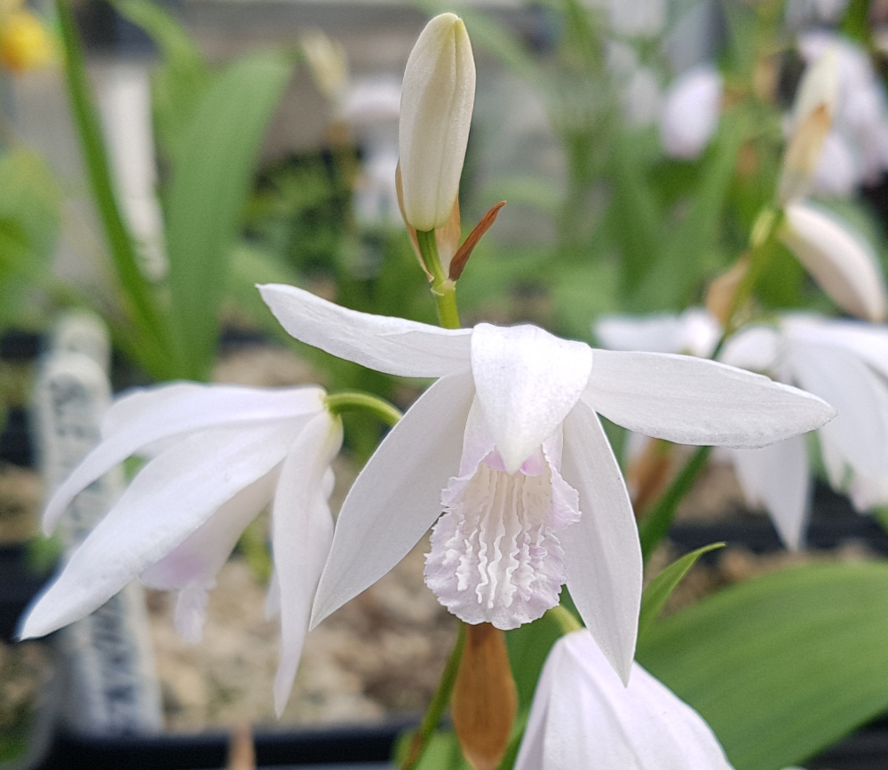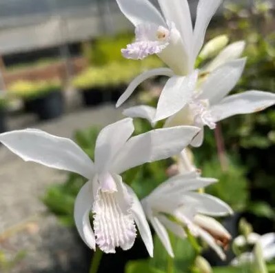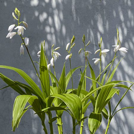 Eigenschaften: Japanorchidee 'ALBA VARIEGATA' stammt aus China. Diese Gartenorchideensorte besticht durch ihre unschuldige schneeweiße Farbe. 6–12 Blüten wachsen auf einem aufrechten Stiel, der aus fünf schmalen Blütenblättern mit einem markanteren zentralen Kelch besteht. Sie blühen im Juni für 2–4 Wochen. Die hellgrünen Blätter sind leicht faltig. Sie wird 40-50 cm hoch. Sie können direkt im Blumenbeet oder im Topf angebaut werden.