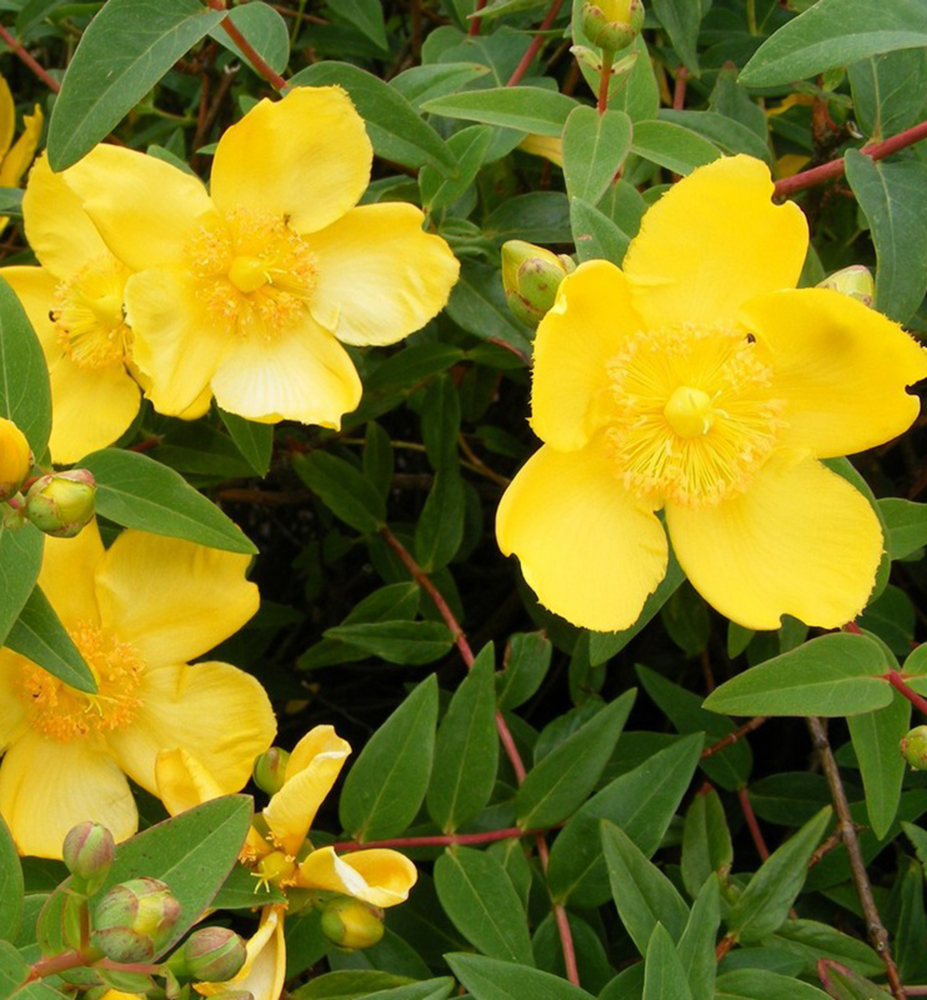 Eine niedrige, beliebte Johanniskrautsorte mit kugelförmigem Wuchs und üppigen gelben Blüten.