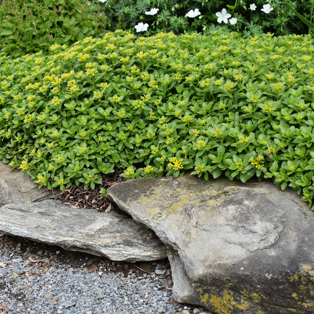 Eigenschaften: Der Kamtschatka-Fetthenne ist eine niedrige, attraktive Steinpflanze, die eine Höhe von etwa 10–15 cm erreicht. Es zeichnet sich durch unverwechselbare gelbe Blütenstände aus, die an dicht gestapelte Sterne erinnern. Sie blüht von Juni bis September. Die fleischigen Blätter haben eine frische grüne Farbe mit gezacktem Rand und sehen das ganze Jahr über äußerst dekorativ aus.