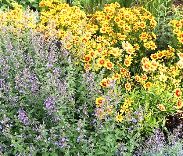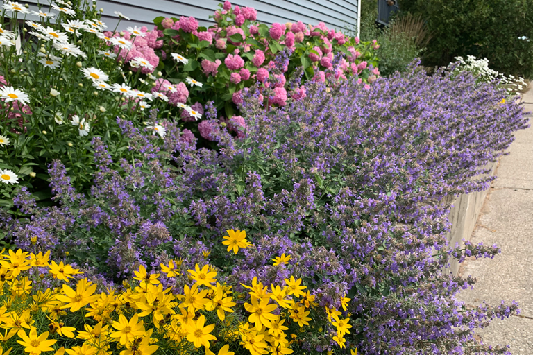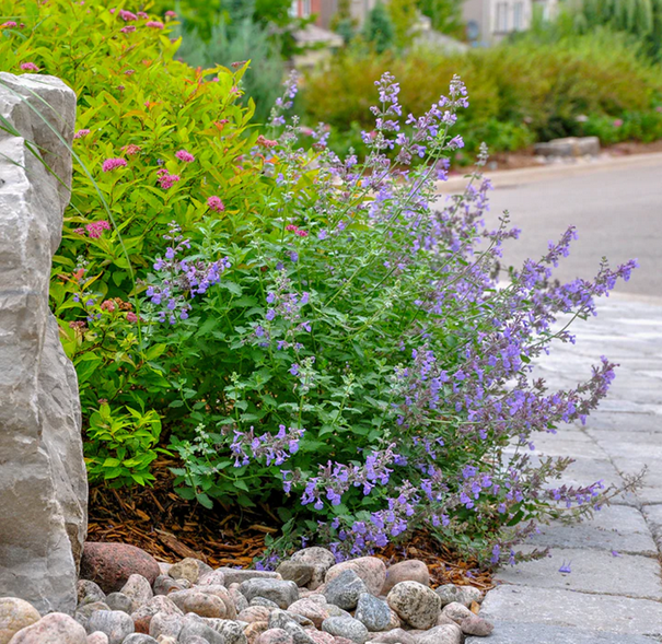 Niedrige, attraktive Katzenminze, die dichte Büschel violettblauer Blüten hervorbringt.