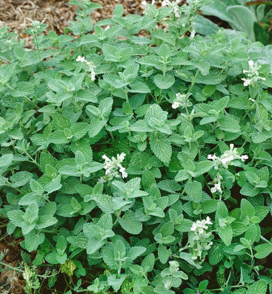 Aromatische Katzenminze mit graugrünen Blättern und ungewöhnlichen weißen Blüten.