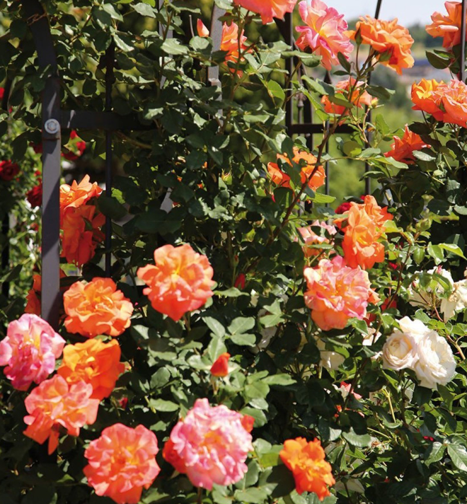 Anbau: Kletterrosen benötigen einen sonnigen, windgeschützten Standort für eine üppige Blüte. Der Boden sollte durchlässig, lehmig und nährstoffreich sein und kann mit organischem oder mineralischem Dünger angereichert werden. Die Pflanzen werden in der Nähe einer Rankhilfe – z. B. Mauer, Rankgitter oder Pergola – im Abstand von ca. 10 cm gepflanzt. Junge Triebe werden mit Klammern an der Rankhilfe befestigt, bis sie sich selbst darum winden. Regelmäßiges Gießen und Schneiden, insbesondere ein Rückschnitt zu Beginn der Vegetationsperiode, fördert eine reichhaltige Blüte.