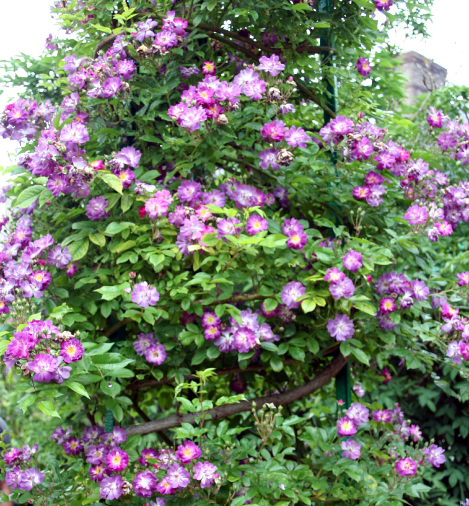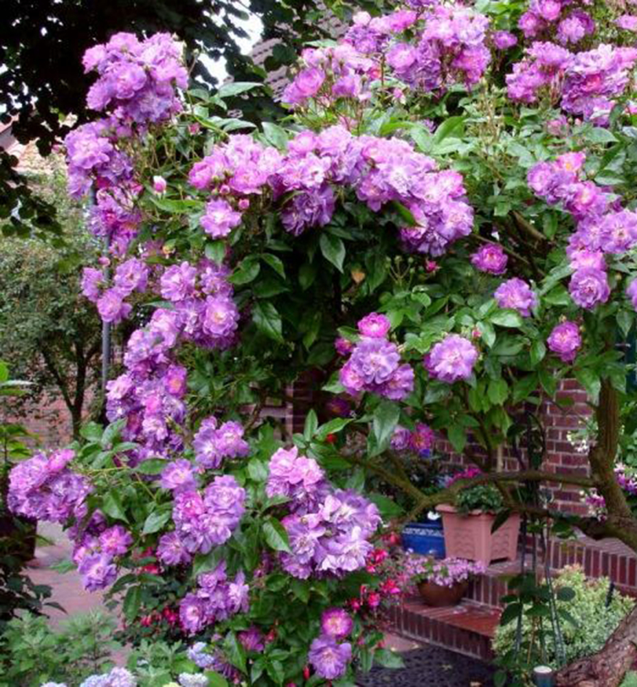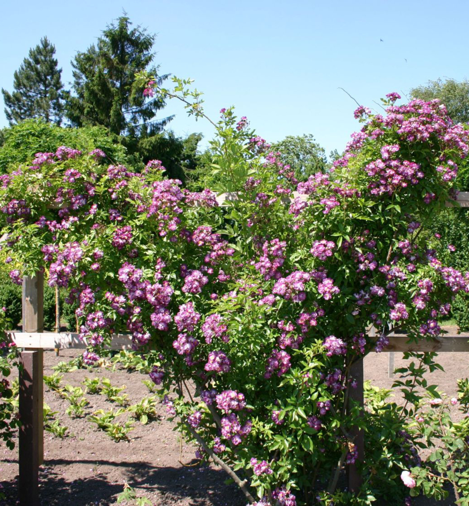 Kletterrose ´VEILCHENBLAU´, Cont. 1,6 l, Pflanze mit Rankhilfen
