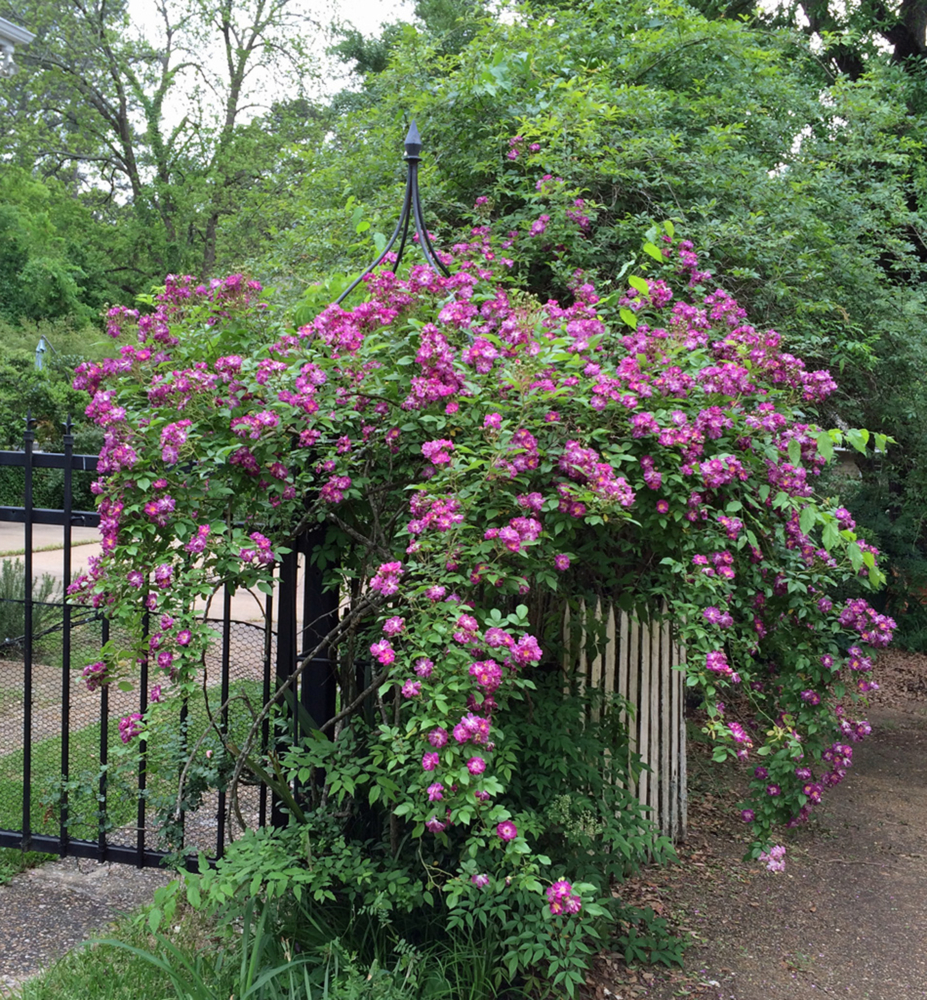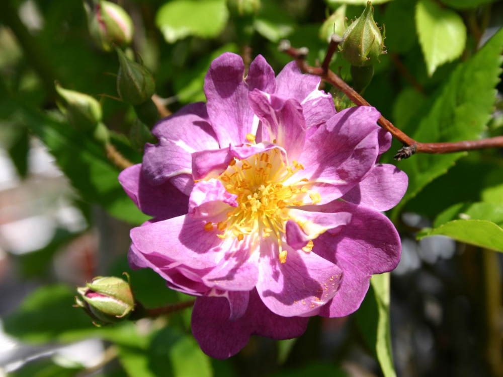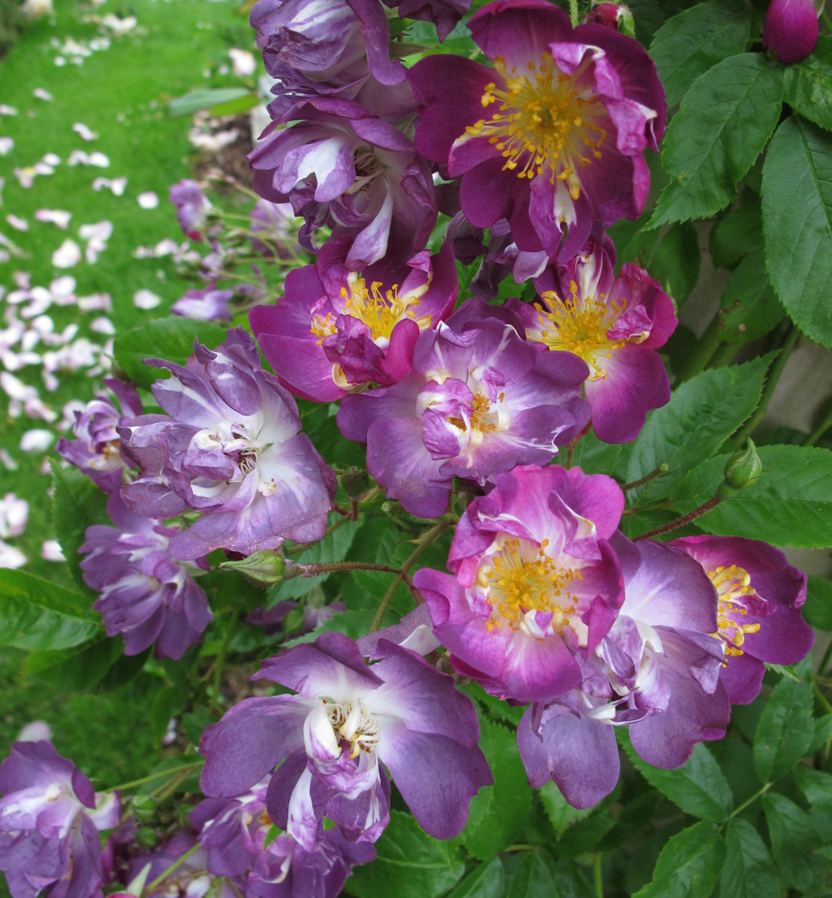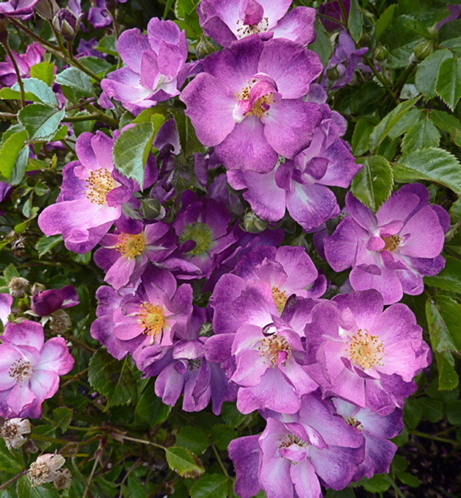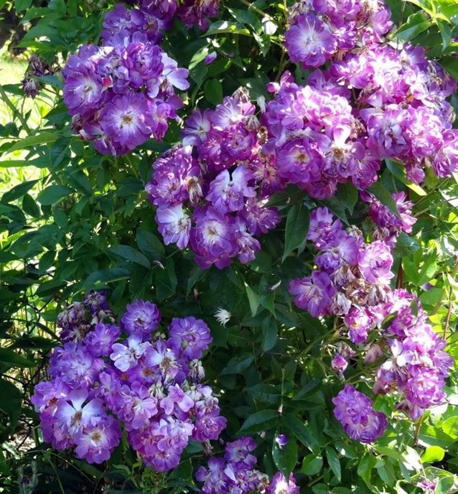Eigenschaften: Die Kletterrose 'Veilchenblau' ist eine reich blühende Sorte mit vollen, intensiv violetten Blüten mit weißen Streifen und einer weißlich-gelben Mitte. Die Blätter sind klein, leicht glänzend, hellgrün. Es wird bis zu 4,5 Meter hoch. Dank seiner nahezu dornenlosen Triebe eignet er sich hervorragend für Pergolen oder Pavillons.