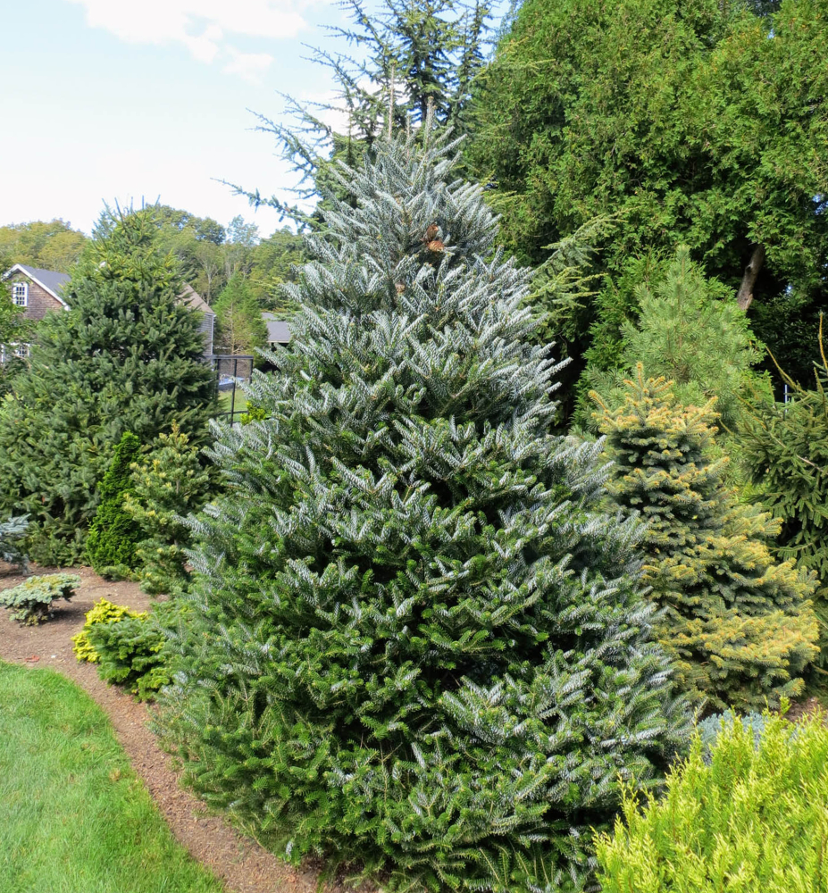 Die Nadeln sind kurz, dunkelgrün und zeigen eine stark kontrastierende silbrig-weiße Unterseite, wodurch die Tanne ganzjährig ein attraktives, zweifarbiges Erscheinungsbild bietet. Die aufrecht stehenden Zapfen sind zunächst dunkelviolett und verfärben sich später grün. Diese Sorte eignet sich hervorragend als Solitärgehölz sowie für gemischte Pflanzungen. Aufgrund ihres schlanken Wuchses ist sie auch für kleinere Gärten gut geeignet.