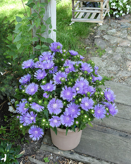Eigenschaften: Die Kornblumenaster ist eine vielseitige Staude aus dem Südosten der USA, wo sie in Kiefernwäldern wächst. Die Sorte ´MEL’S BLUE´ besticht durch ihre intensive Blütenfarbe und den kugeligen, kompakten Wuchs. An den festen, aufrechten Stängeln erscheinen 6–8 cm breite, kräftig lavendelblaue Blüten, die sehr langlebig sind und Hummeln sowie Schmetterlinge anziehen. Im Aufbau erinnern sie an Astern- und Kornblumenblüten. Die Blütezeit reicht von Mitte Juli bis in den Herbst. Die langen Blätter bilden eine grundständige Rosette, während entlang der Stängel deutlich kürzere, schmale, lanzettliche Blätter wachsen. Die Kornblumenaster eignet sich gut für Stein- und Naturgärten, Cottage-Gärten sowie für die Kübelkultur.