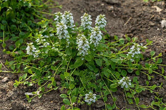 Eigenschaften: Der kriechende Günsel ´ALBA‘ gehört zu den pflegeleichten Heilstauden. Ab Mai bilden sich an aufrechten Blattstielen stachelige Blütenstände mit kleinen weißen Blüten. Die Pflanze erreicht eine Höhe von 10–15 cm und eignet sich hervorragend für Töpfe, Mischgefäße oder als Abdeckung unschöner Flächen. Traditionell wird sie bei Verdauungsproblemen, Rheuma und zur Blutdrucksenkung eingesetzt.