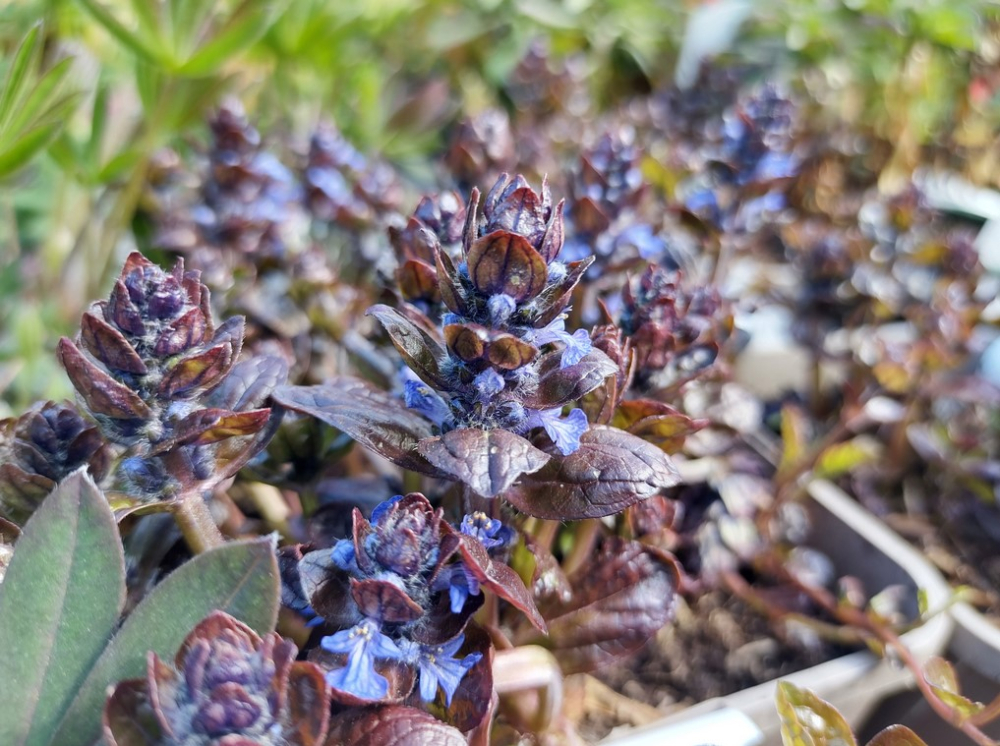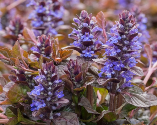 Bodendecker-Kraut mit grünbraunen Blättern und violettblauen Blüten.