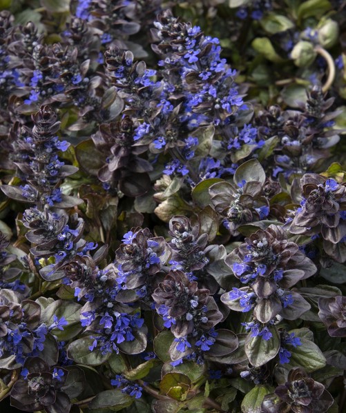 Ein attraktiver, mehrjähriger Günsel mit blau-violetten Blüten und braun-grünen Blättern.